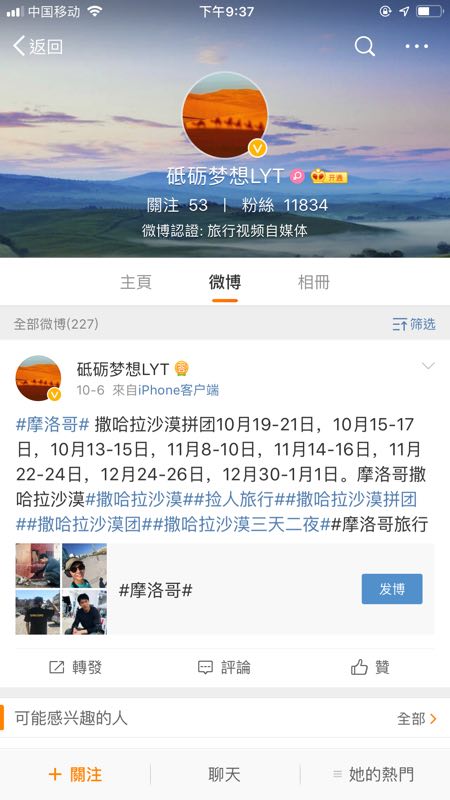 撒哈拉3天2夜 坐車坐到快要吐之旅這次的撒哈拉之旅是網美在微博上找到的沙漠拼團,我們訂的是6人豪華團,價格是210歐,總體很滿意給大家推薦一下:微博名字【砥砺梦想LYT】他們有清楚的價格和清楚的路線介紹,司機和帳篷 都安 排的很好。