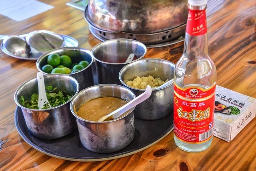 椰子鸡是清汤,口味清淡的可以品尝椰子和鸡肉的原味,喜欢蘸小料的,也有自助台可以自由搭配,上面有官方指导配方。