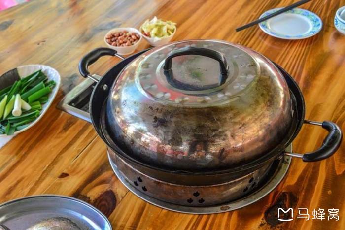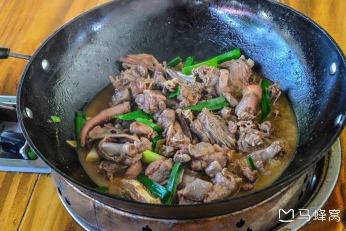 接近着端来一盆腌制过的鹅肉和炒料,在桌上直接炒制