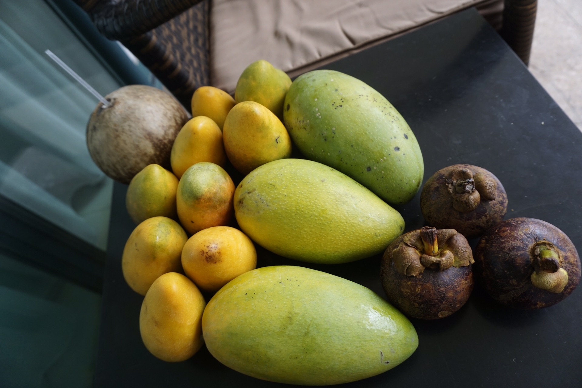 Lucy正好也睡醒了,在柔软的床上跳来跳去,我问她喜欢这个新的酒店吗,她说喜欢 我们简单整理了一下就下楼逛逛了。海韵的内部花园比起之前住的酒店确实小了很多,泳池也就是中间一个大泳池,注意哦,大泳池不是恒温的,水很凉!(这点是第二天才知道的)在大泳池旁边有个很小的恒温池,还有两个大滑梯。不过我们现在并不打算游泳,简单逛逛就准备去负一楼的中餐厅吃饭了。 准备回酒店的时候看到超市门口有几个妇女挑着担子卖水果的,过去一问,芒果不论大小,不论品种一律5元一斤!山竹12一斤!是很便宜了,赶紧买了好多 拍这个照片的时候已经吃了一些啦