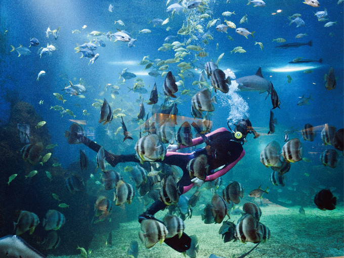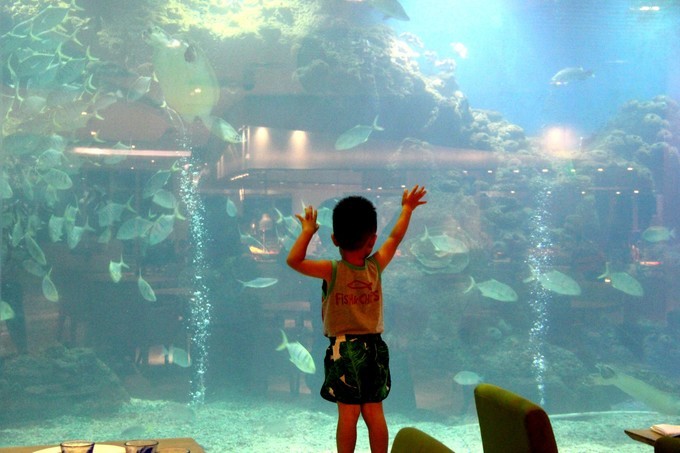 特色的海蓝餐厅是亚洲首家海底世界餐厅,可以一边品尝美味,一边看潜水员与鱼儿互动,小朋友会很喜欢。