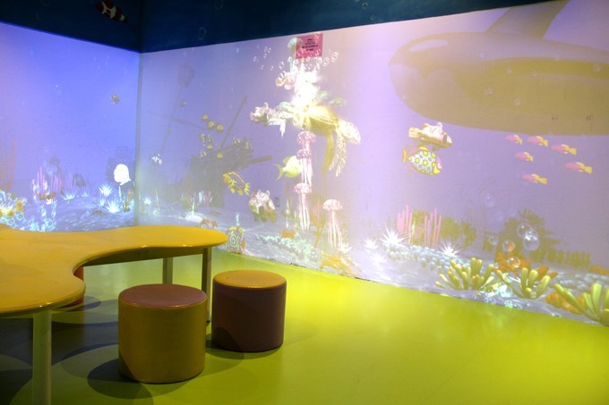 儿童乐园里面的设施很齐全,而且分类布局。有孩子们的乐园区,绘本区还有绘画室等。可以在这里度过了一个快乐而充实的下午。尤其喜欢这个绘画室,电子设备制作的动态海底布景,可打印不同种类不同形态的鱼,孩子们根据自己的喜好为之上色,之后可投到动画电脑上,机器自动识别并会在大屏幕上显示。
