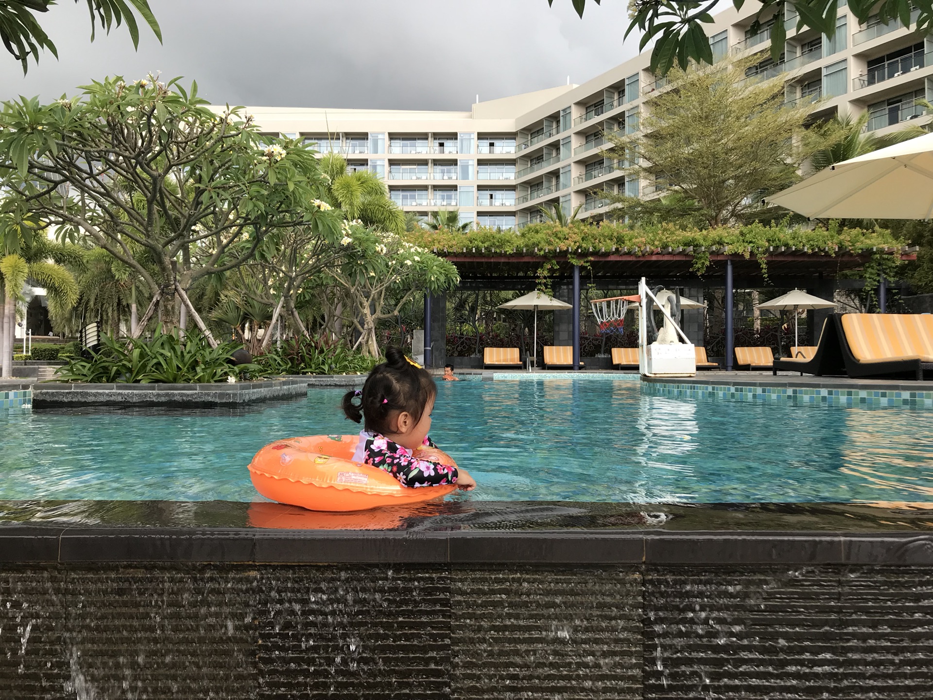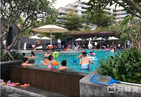 东南亚 风格的建筑,酒店蛮大的,公共泳池很多也很大,在网上看的图片我就很喜欢,亲自来了之后,也是很满意。小家伙已经瞧上了酒店中央环形相对的泳池和各种游乐设施,但他绝对不同意“热闹是他们的”,便急急央求要下水玩耍。