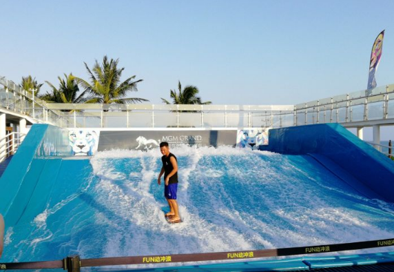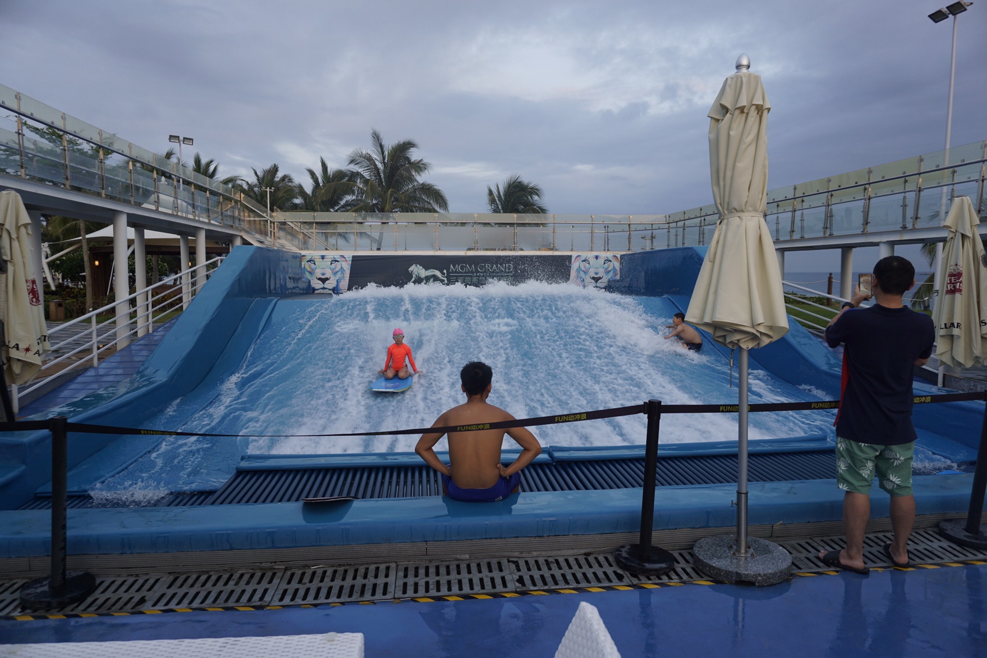 睡醒了外面也不下雨了,我们收拾一番就去海边咯!美高梅的台阶很多,不想走台阶的话需要从旁边绕,这个设计本来就不是主打亲子的酒店吧。路也不太远,不推婴儿车也是可以的。路过一个冲浪池,收费的,喜欢的朋友也可以试试