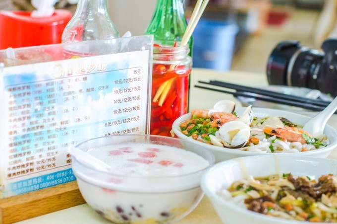 君瑞酸粉的价目表除了各种汤粉, 的街头小吃中还有一位明星,这是一种甜食,一种以椰奶、绿豆、红豆、淮山、莲子、茨实、薏米、西米、百合、红枣、杏、西瓜、菠萝、龙眼等水果做成的糖水,在炎热的,在太阳嗮得汗流浃背的下午,一碗透心凉的清补凉可以让你体验到人生美好。推荐店铺:郑阿婆清补凉 特色:椰奶冰球清补凉,团购价:12.9元。地址: 友谊 街奥斯卡边上(海关铺面A栋)电话: 13807533929营业时间:10:00--未知,可电话询问