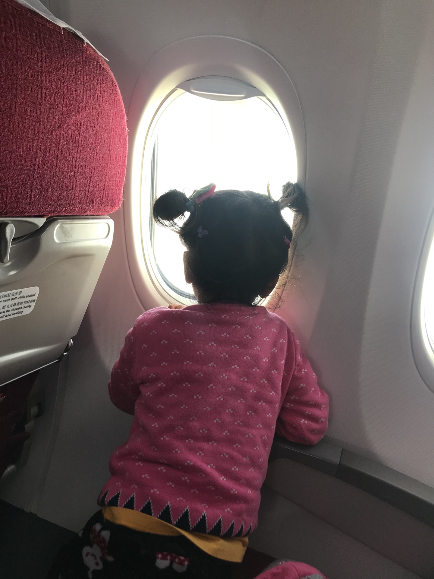 坐在窗前摆拍一下也是蛮好的,哈哈😄星期天 起飞咯!我们是11:50的飞机,时间很宽松。早晨睡到7点半左右起来,收拾好吃过早饭把车开到停车场再到机场,时间是9:35,办理行李托的时候被告知,遛娃神器需要到超规行李托运处办理托运,估计婴儿车之类的都是这样吧。在机场逛逛,拍拍照,时间很快也就到了。Lucy第一次坐飞机,非常的兴奋,在候机的时候就不停的问我,妈妈我们怎么还没坐上飞机啊 到了飞机上自己选择了靠窗的座位,小姑娘才不到三岁就已经很有主见了,生活中很多时候也是自己拿主意,我们也尽量尊重孩子的意见。飞机起飞时,我怕她耳朵不舒服,不断的和她说话,让她吃东西,结果Lucy很能适应这个,一点也没有不舒服的感觉呢