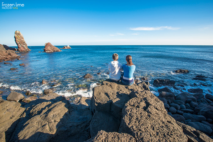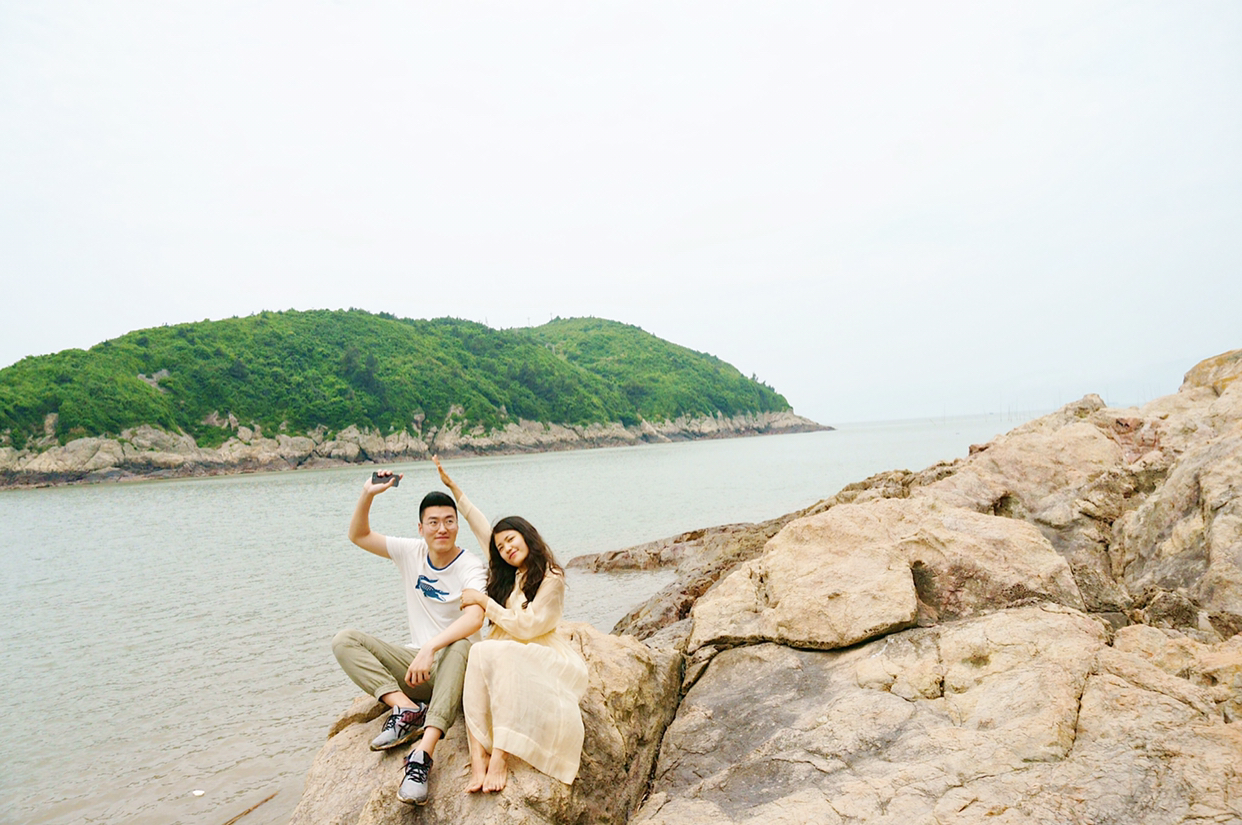 风变大了,有涨潮的迹象,快被海水包围了,赶快跑啊!次老师因为脚划伤了,只能脱一只鞋,哈哈哈哈哈哈哈哈哈。赶快绕道逃到右边的礁石上去