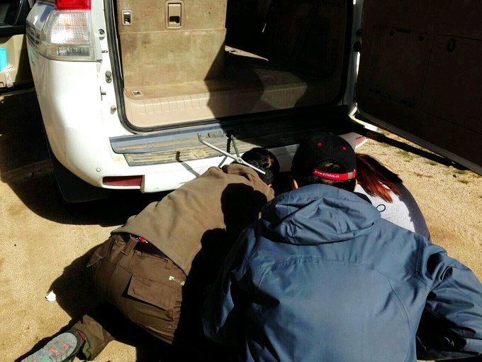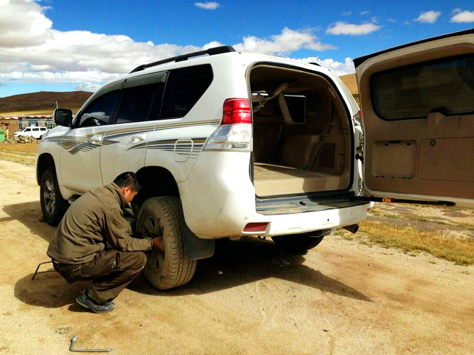 在纳木措回程路上,我们的座驾意外爆胎了,当时还在爬坡,司机说这种情况很危险,好在我们的司机师傅技术很好,把车停稳了。接下来就是我们此行我印象最深的地方,大伙齐心协力在海拔4000多米高的地方换轮胎。男生帮忙,而我,则为他们记录下了这宝贵的一刻。也很感谢路边的藏族大叔的帮忙,要知道在高原换胎,绝对是体力活。