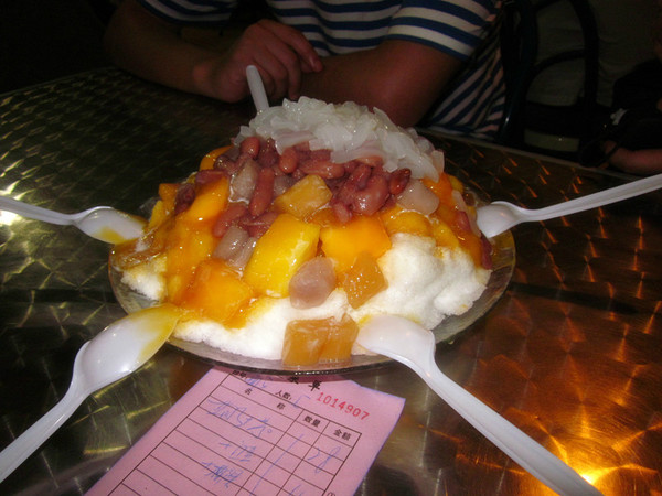 天黑以后是属于美食的时间。按照攻略,我们一家家把推荐的龙头路小吃品尝了。龙头路189号的土笋冻撒上了蒜泥和辣椒,口味浓重,却也爽滑,很是过瘾。无意中发现的“甜心凯特”的芒果绵绵冰成了这炎炎夏日的解暑佳品。继续前行,是被同样推荐的“林氏鱼丸”,算是老字号吧,觉得虾丸是个亮点,非常弹滑鲜美。其他的,还有浓浓的马拉桑、鲜美的当归牛肉面、烤生蚝等等,边走边吃,直到每个人都撑得再也吃不下一口。