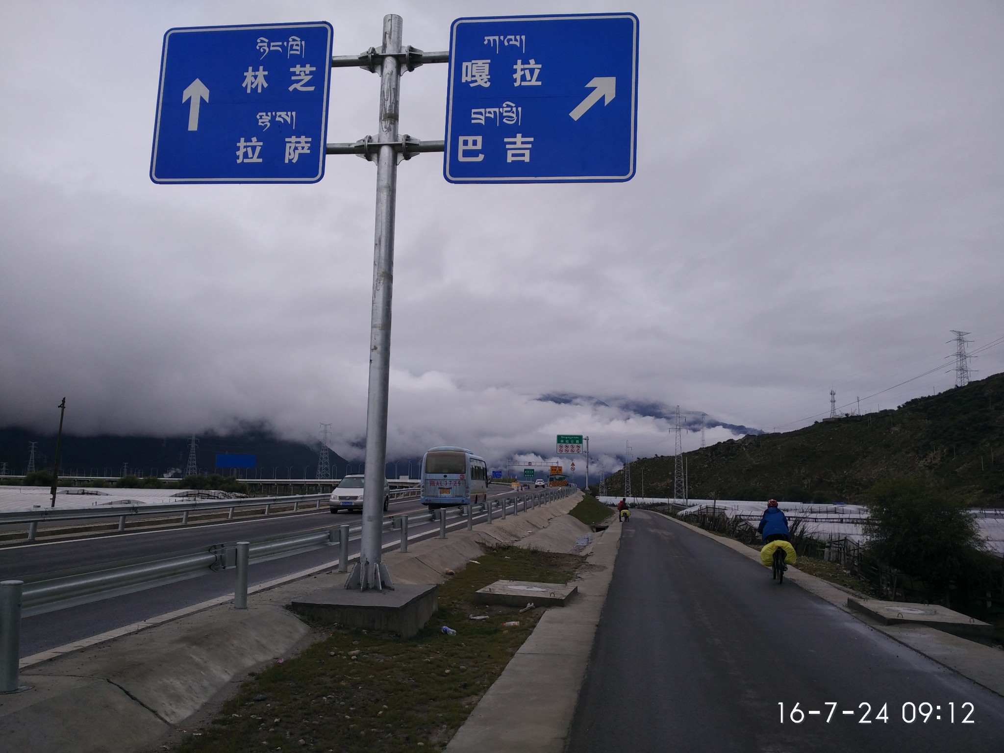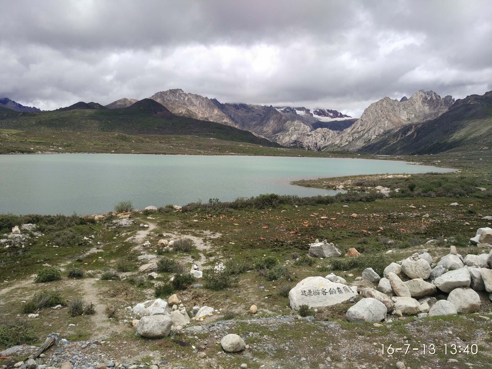 -------------------------------------------------------------------------------------------------------D16 吉达乡--安久拉山--然乌 53km 2013.6.28 阴早上醒来,亚麟已经离去,在吉达饭店洗簌完毕,一人整理行装骑车前行。越入藏区物价越贵了,在过吉达后一个村委会停车煮面吃早餐,期间得到来村委上班藏妹子的帮助,给我的面加了些调料。今天的行程只有53km,不过状态不好且全程逆风兼不定时小雨,一路上一个人听着音乐走走停停过3838处留了个言往下走,藏区兵哥们正在雨中疏路,看着他们的粮食居然是干泡面,敬佩之情悠然而生。路上会想很多很多问题,不过都想不起来了,日子就是这样,除了能沉淀下来的其他经历过的都被边缘剔去,有人说青春就该随心所欲敢性而为,被禁锢的越久心就越不自由,大多数人只是想却不去做,正如以前的我,我喜欢先做在考虑余下的问题,也不知道对不对,至少做过就不遗憾了,就像青春,都该有属于自己的疯狂与无畏。过安久拉山垭口自拍了几张,一个人骑着车到海子边呆了很久然后蹬车下山,回归一个人旅程,想走就走想停就停想说话就大声说要安静就沉默,喜欢那种感觉。