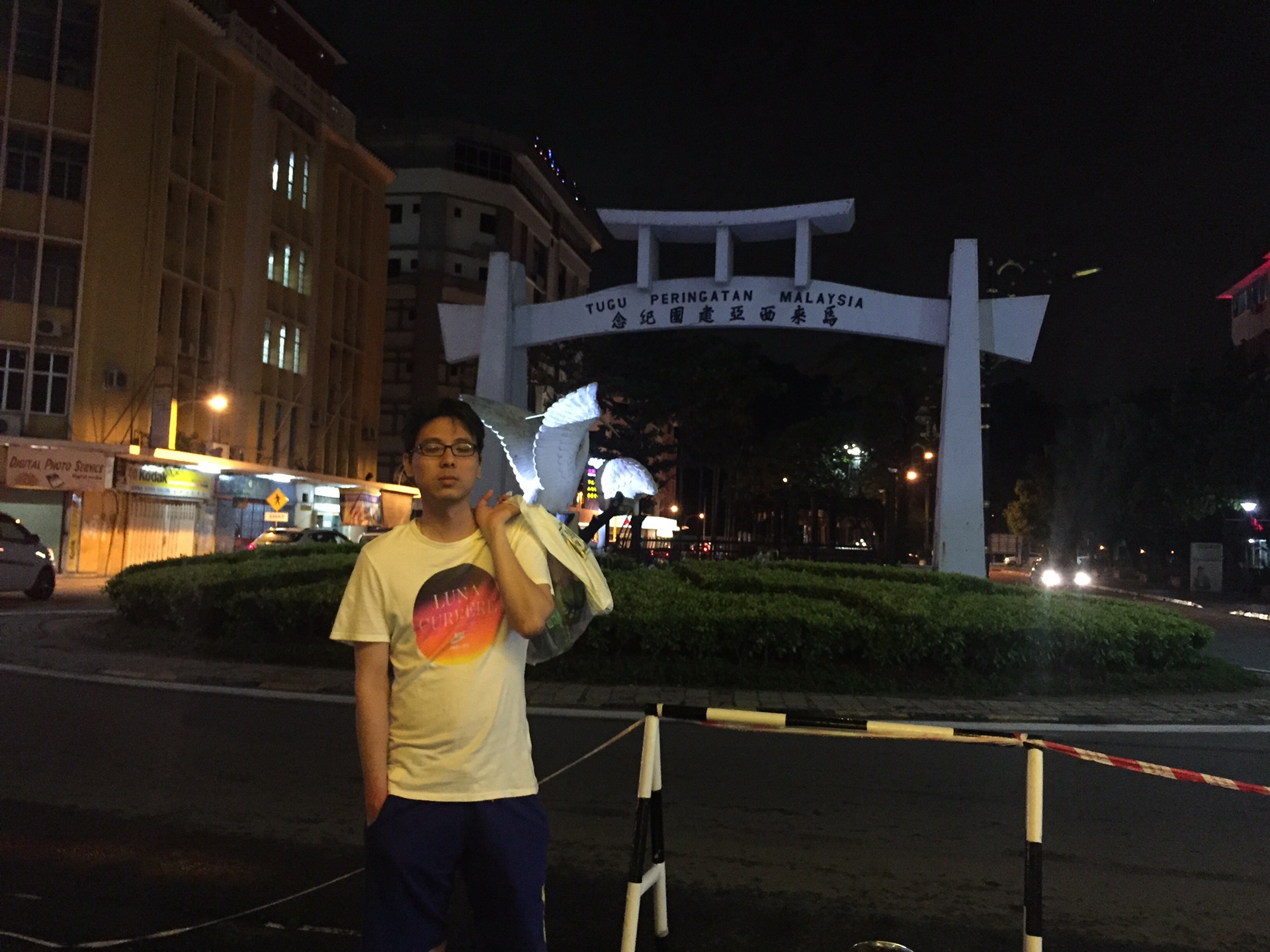 吃完饭就继续沿着加雅街走,见到冯业,不过吃不下了,然后去美丽华买特产,买了芒果糖和什果糖,还有沙巴茶,虾片,然后就去默迪卡找兑换店,了解了汇率后,我们没有换,因为在百年换了600马币,应该够花几日。然后往前走,去曙光商场吹冷气,闲逛,大肚佬买了条短裤,28马币,超便宜,然后就出去拍照,以下就是和各种地标的合照