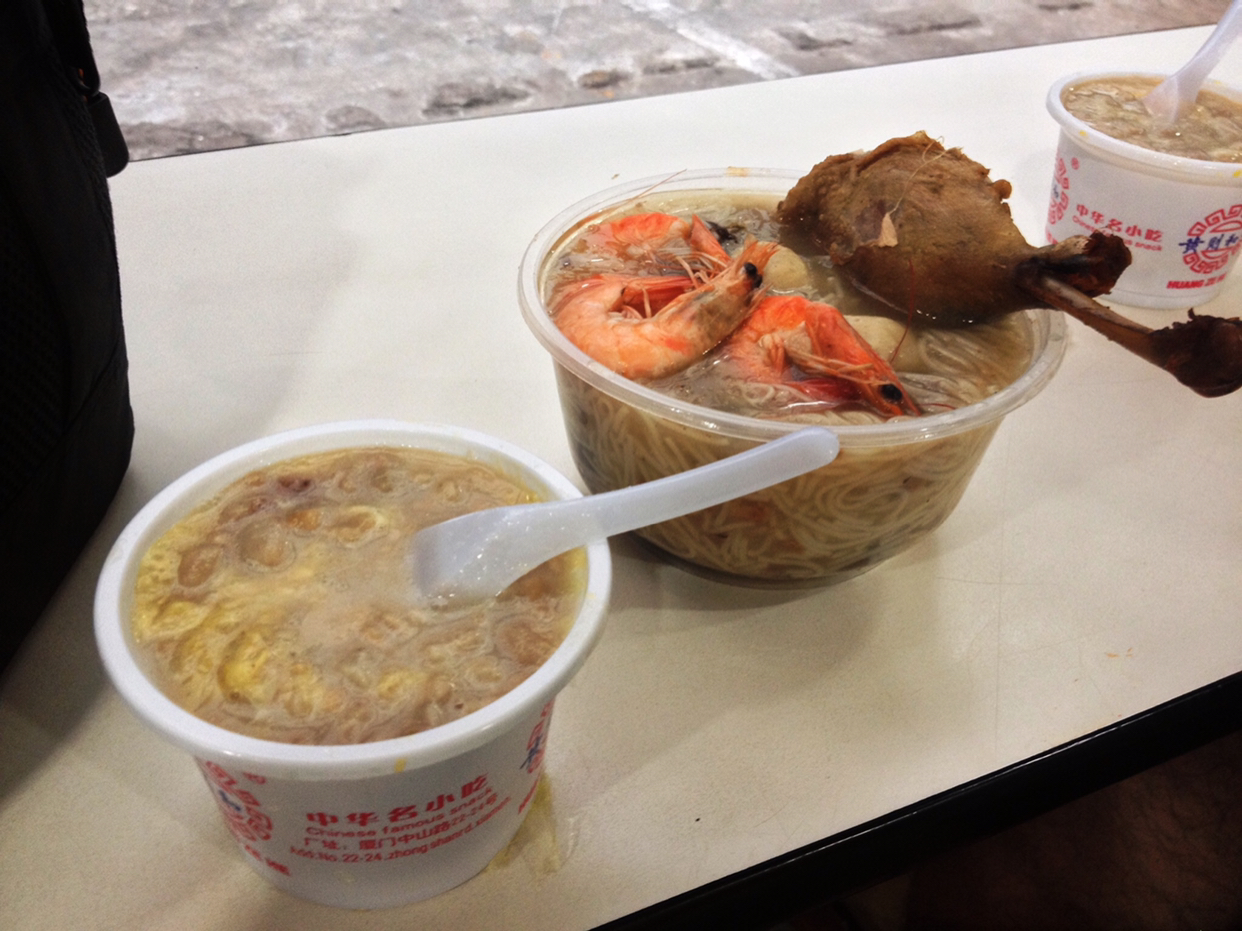 晚饭选在了“四里沙茶面”,是出租车师傅的推荐。店面很小,浓郁的沙茶汤汁里加上了鸭肠、猪肝等食材,感觉像南方的卤煮,口味和口感都不错。