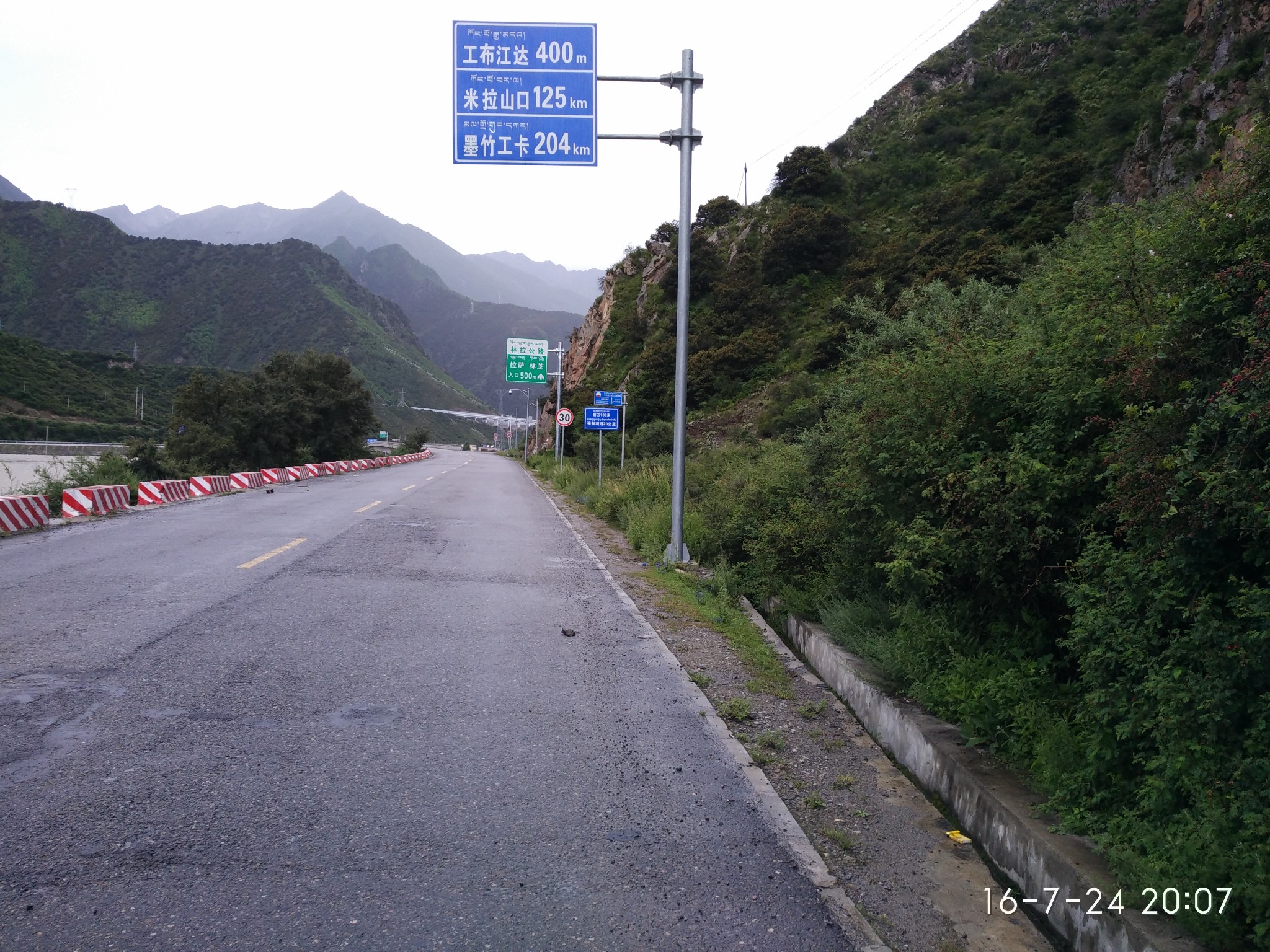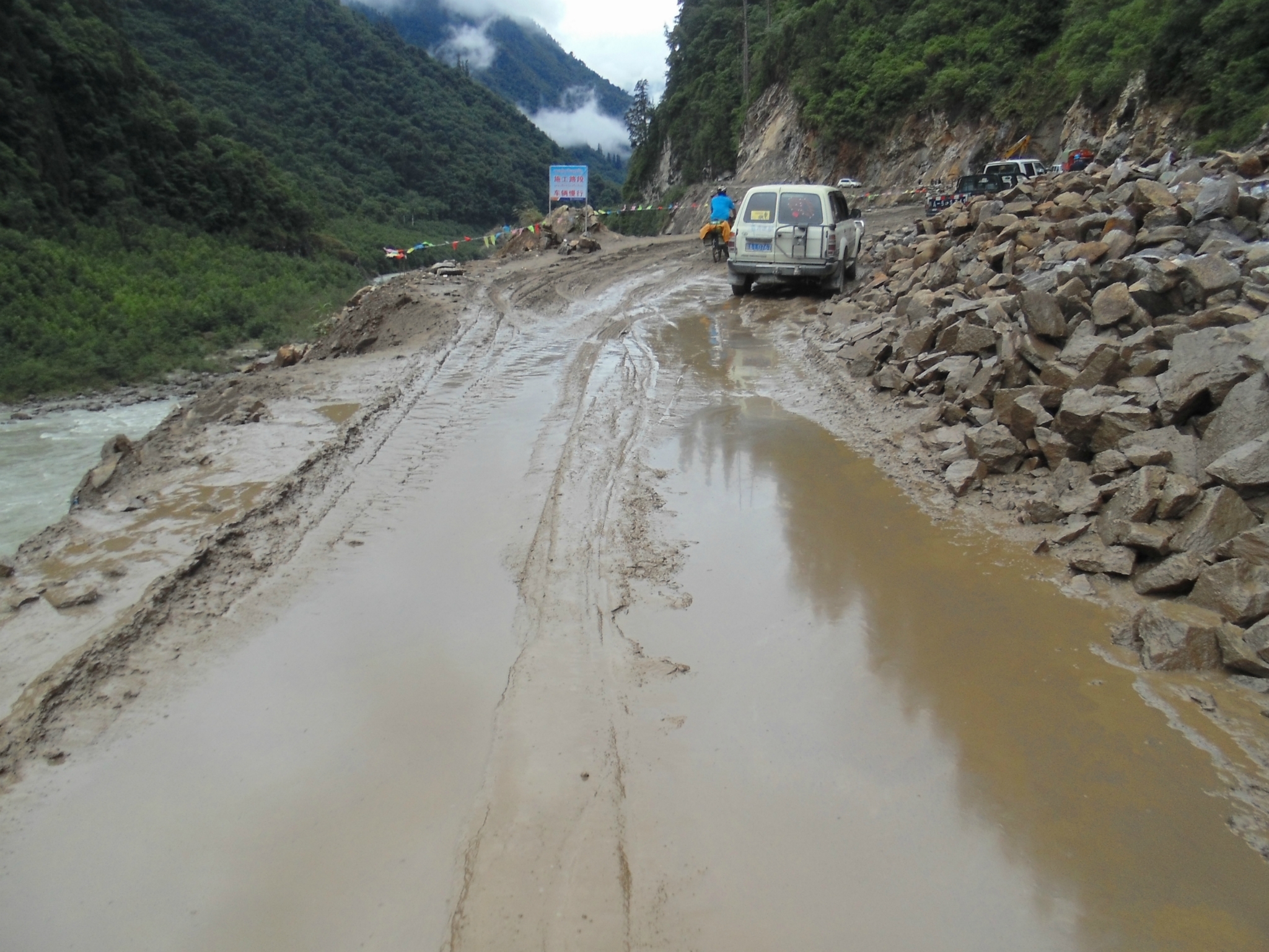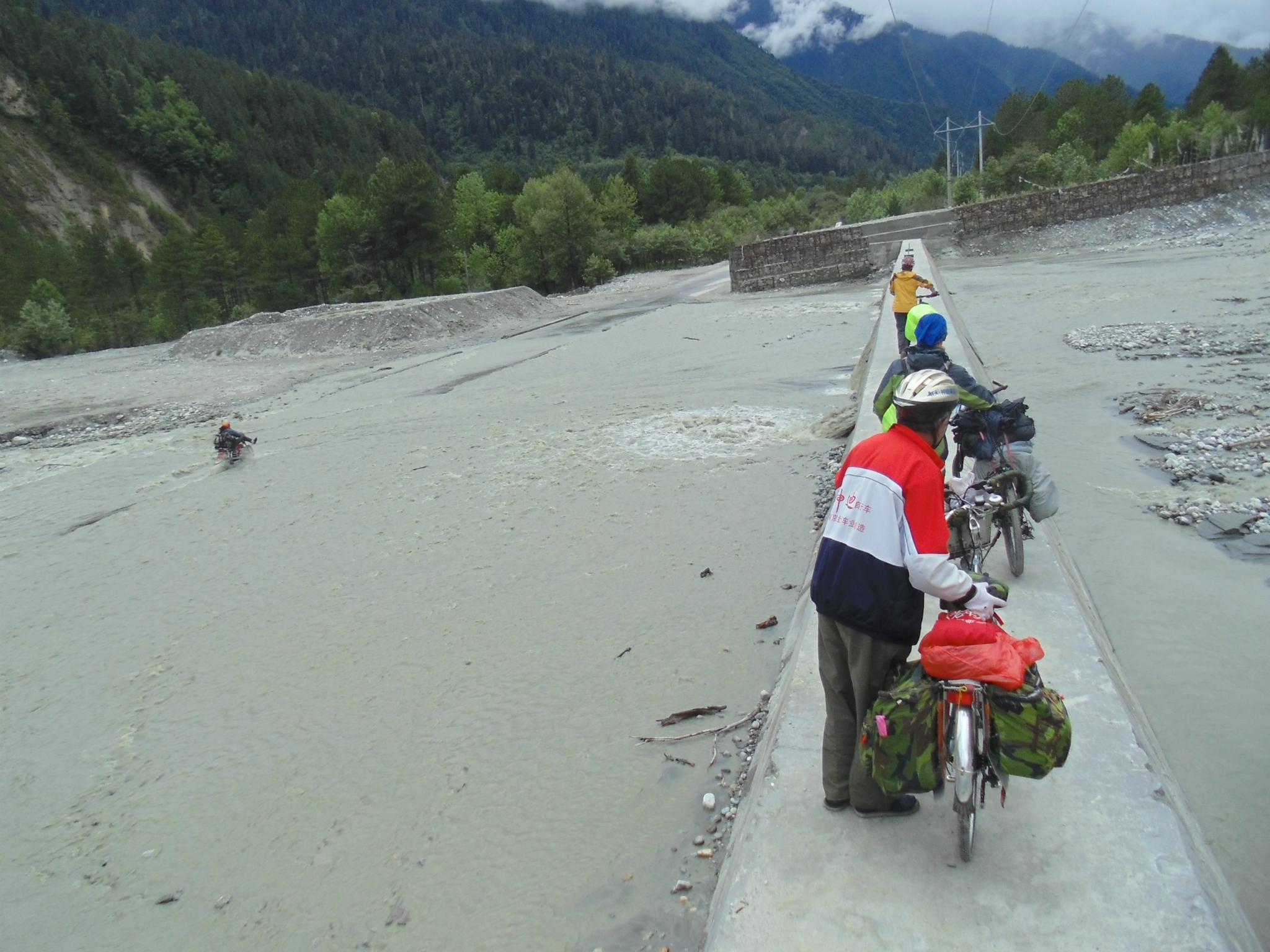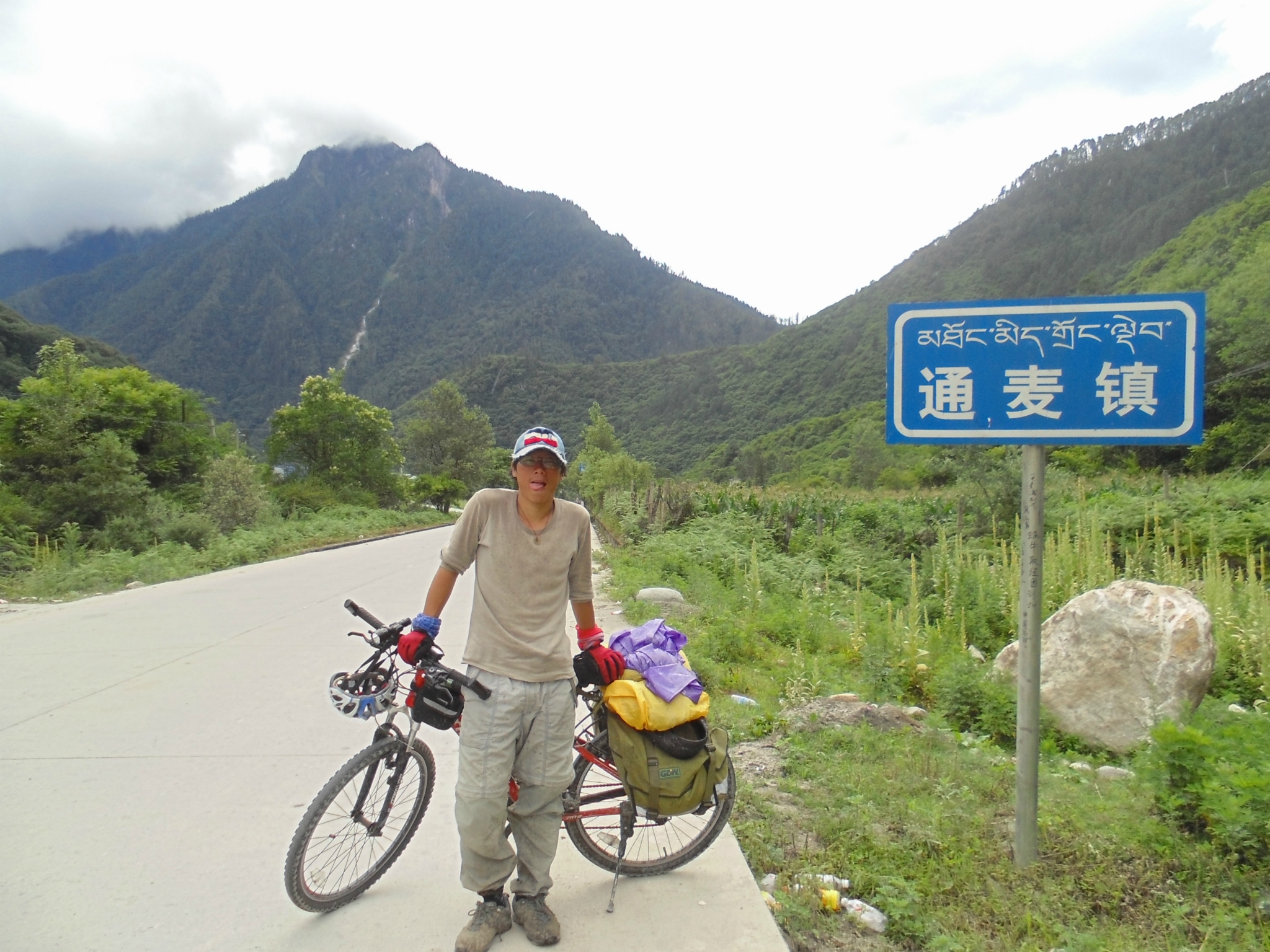 -----------------------------------------------------------------------------------------------------D18 --古乡--102塌方区--通麦 2013.6.30 92km 小雨-晴--小雨与峰仔一起在昨天的小吃吃早餐,油条2块稀饭1元小笼包6元8个都很好吃,推荐,老板娘人不错,人。等到10:30邮局准时开门,排队盖章立马走人,今天行程92km,基本都是下坡路,后段2kmS形上坡4km烂泥路外加N个起伏路。这一路的风景很美,也很险峻,从到故乡,会经过一个蝴蝶缤纷的地带,哪里有超多的蝴蝶,成千上万的飞舞~过4044处,有一个深水涉水区,一群骑友的互相帮助下黯然通过,通过后不久一位哥们摔车压到腹股沟处无法前行。这天也是老妈生日,一路上在想着如何精心给老妈一个生日惊喜,最终给老妈的彩信也没能收到,真是遗憾,还是要补上一句:老妈生日快乐!! 往后就到通麦了,通麦实行交通管制,4个轮子的通通排队等候,也不知道前面有出啥事了,希望一切平安!!今天到住处,洗澡靠墙跟来两小妹妹聊天被马蜂蛰了一下,疼死爷了,然后晚上头回吃到满盘辣椒的鱼香肉丝,我天!!还30/盘... ----记 通麦 通麦乡村饭店