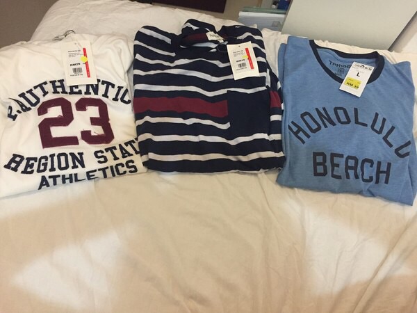 衣服主要是imago的padini(兩件男t,29rm一件)和terranova(两件男t➕一件女t➕短裙,39RM一件,买2送一),H&M女t一件,价格如图。当时terranova有活动,买2赠一,所以就买了同价格的三件,为了搭配,又花25rm买了一个女t。马来西亚本土品牌Vincci就在padini里面,马来西亚商场的好多店里面都是好多牌子的colltection,而且很便宜我沒有買vincci主要是因為担心太占地方,但是鞋子真的是很便宜200港币以下能买到很好的鞋,样子也时尚。带行李箱的妹子一定不要手软。大肚佬在曙光买了一件短裤,今年流行的蓝绿色,28马币一条,超划算,牌子忘记拍照了。反正也是服装超市那种店铺。
