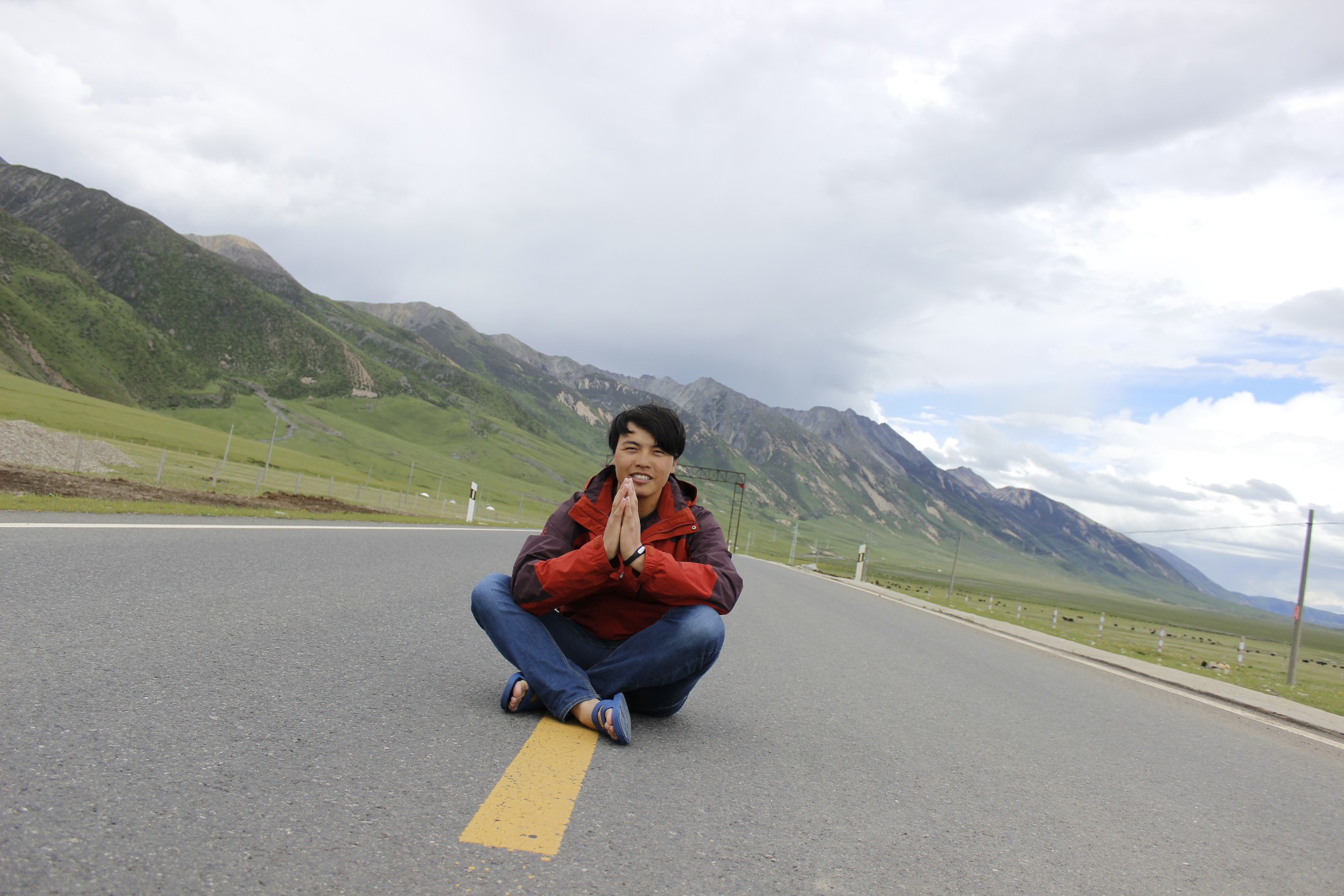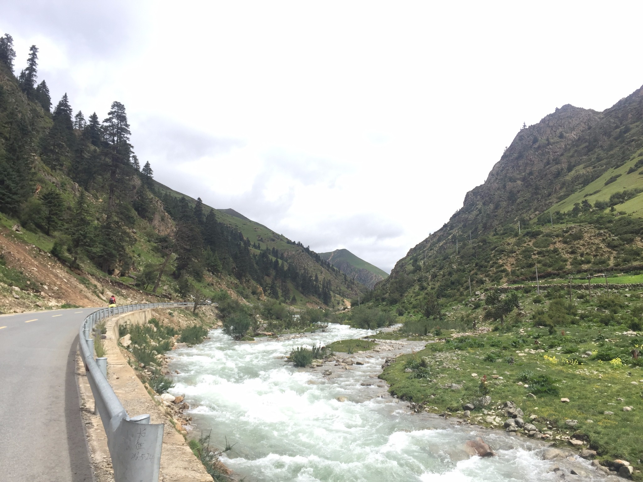 驮包和背包里的行李基本已经湿透了 担心着明天能否安然上业拉 听着窗外的雨声 感觉困难重重-------------------------------------------------------------------------------------------------------D15 -业拉山-大桥 -拉根乡--吉达乡 2013.6.27 晴昨天在青旅电脑前上传照片 不知道外面已经在飘大雪了 索然无知 只知道双脚冰冷无法回暖 早上起床 嗓子开始疼痛 赶紧又是两粒氨加黄 左氧氟沙星和利巴韦林 嘿 还真他妈管用~昨天鞋子已经湿了 所以穿着拖鞋上路 出门右转进入318 一出镇口 被满山的大雪给吓一跳 原来一晚上都是下雪的节奏~ 赶紧掏出登山鞋 裹着塑料带开蹬 这是要冻死人的节奏啊 光脚爬业拉雪山~~ 我去~不过今天感觉爬业拉很轻松 要是天气在晴朗点 又是美翻一片