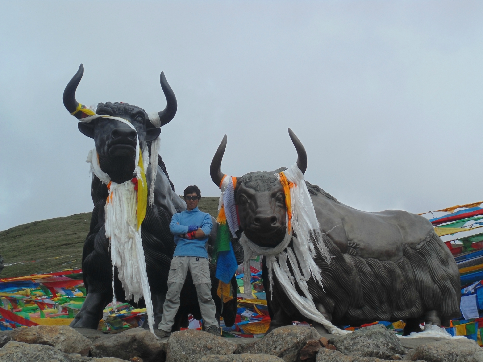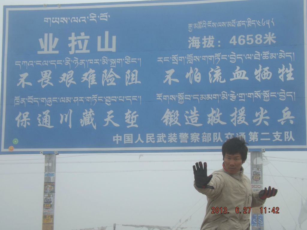 ---------------------------------------------------------------------------------------------------------D23 松多--米拉山------ 2013.7.5 176km 小雨-晴最好一天的行程,在松多旅店,发现每个人都表现出莫名的兴奋,今天的行程近180km,是本次滇藏或者川藏行程那个最长翻山最高的一天。早5:30闹钟起床,因为人多排队磨蹭到7点出发,刚出松多就是一段泥泞路,然后是无止境上山爬坡,当时还不知道自己爬的半死的那座山就是米拉,直到上了垭口转弯赫然看到“米拉山海拔5013”还有三只傻大牦牛像及两只SB藏獒我才缓过来老子已经站在全程的最高点了把包里的零钱全部变成零食,开心,一路边骑边吃的向迈进。晚7点多杀到,停留在最后的462界碑,拍了拍道个别向五十块上的本尊进击。晚八点在脚下,布宫也已在眼前。