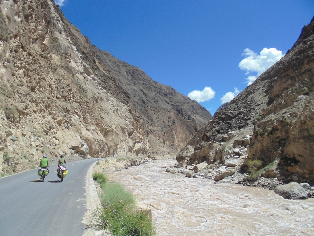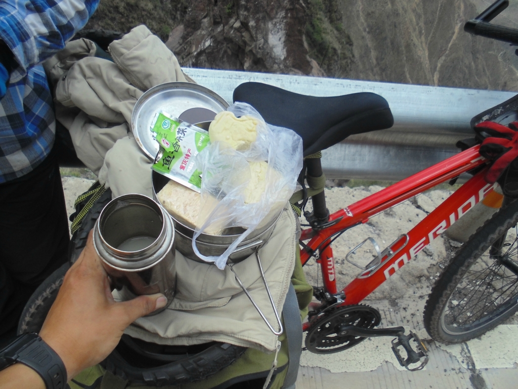 每天的早餐:豆奶+榨菜+馒头还有万不得已时候的压缩饼干大峡谷处看到前方一群藏民且都是男的,很多腰佩藏刀,以为碰到传说中的拦路劫匪,一看,居然还有小孩,硬着头皮停车休息,假装淡定滴问一藏民小伙神马情况,告知是藏族一个传统节日--世界节 貌似是对大山的祭拜,只允许男人参加,刚祭拜完毕正要开始大吃大喝,危险解除厚脸皮精神上来,跑去蹭吃蹭喝了不少酥油茶、大饼、香猪肉汤,藏民同胞们很热情, 不断给你添汤加肉,他们用藏刀切的牛肉,借此机会近距离欣赏了藏族人佩戴的藏刀,很是锋利