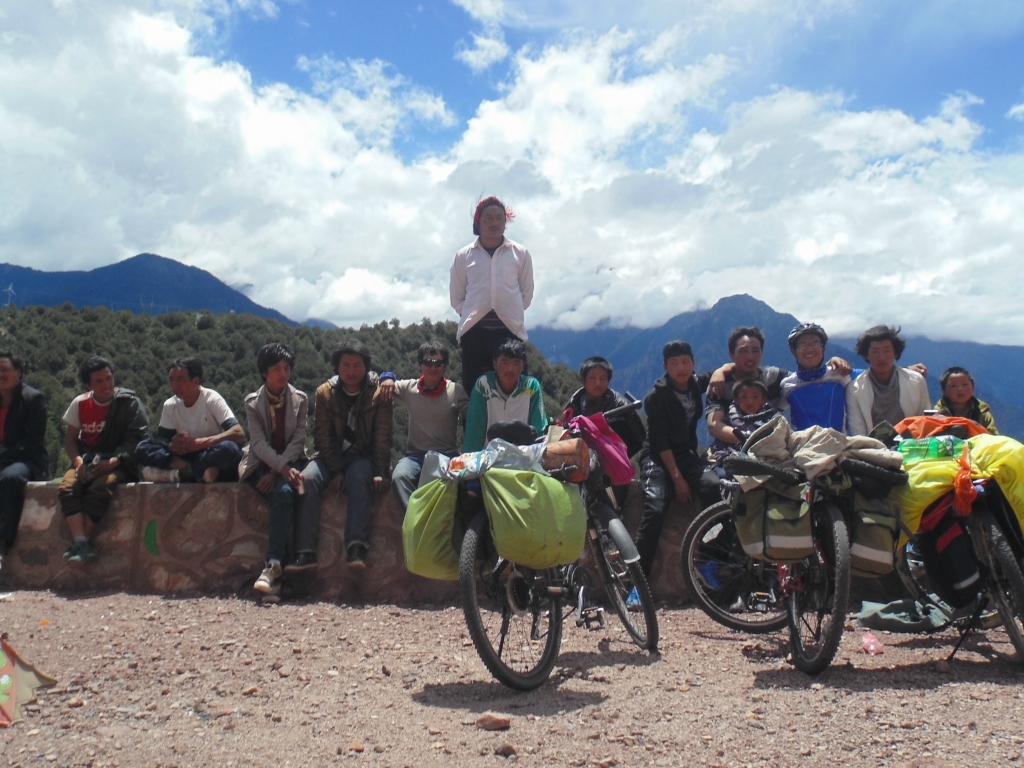 还是用我的万能奶糖骗小孩 哈哈-------------------------------------------------------------------------------------------------------D11 村-- 40km 2013.6.23 晴--小雨--晴今天的行程是昨天的续点,40km到。因为前几天的超负荷,好好休息下,不打算赶进度了。打算到好好休整下,我也换一个我的脚撑外加调试下变速。劲途中,终于经历一次被狗追着跑的狼狈。D12 -拉乌山-如美-觉巴山-登巴 2013.6.24 晴-雨-大雾夹雨雪今天的行程从开始,算是汇入川藏了 214跟318的交接,要翻过拉乌山和觉巴山。进318碰到的第一个界碑,8km的土路然后爬拉乌,算是轻松,期间突发勇猛,第一个冲到了垭口,然巫山的草甸上开满了小花很漂亮~
