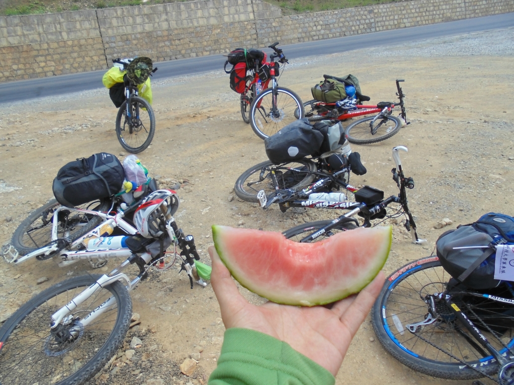 爬到垭口已经筋疲力尽了 过3250 藏族大婶子们在很合适的地方对我们兜售西瓜 说实话我都不敢确定这是叫西瓜的东西 而且3.5元/斤 虽然不是很熟 不过吃起来很爽口 主要是太雪中送炭了