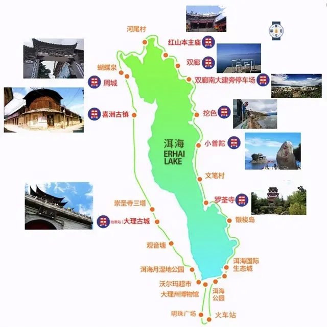 大理的景点基本上都是环洱海的。都在环洱海这一周上面。我们是住在才村码头,所以环洱海是从这边出发。你可以租个电瓶车,自己环,因为这样比较好玩。你可以百度地图,按照线路走就可以了,环洱海路都有提示的,房子或者柱子上都有指示牌,环洱海往哪里走。喜洲古镇,挖色镇等等景点,全部都在环洱海一圈上面。然后崇...显示全部