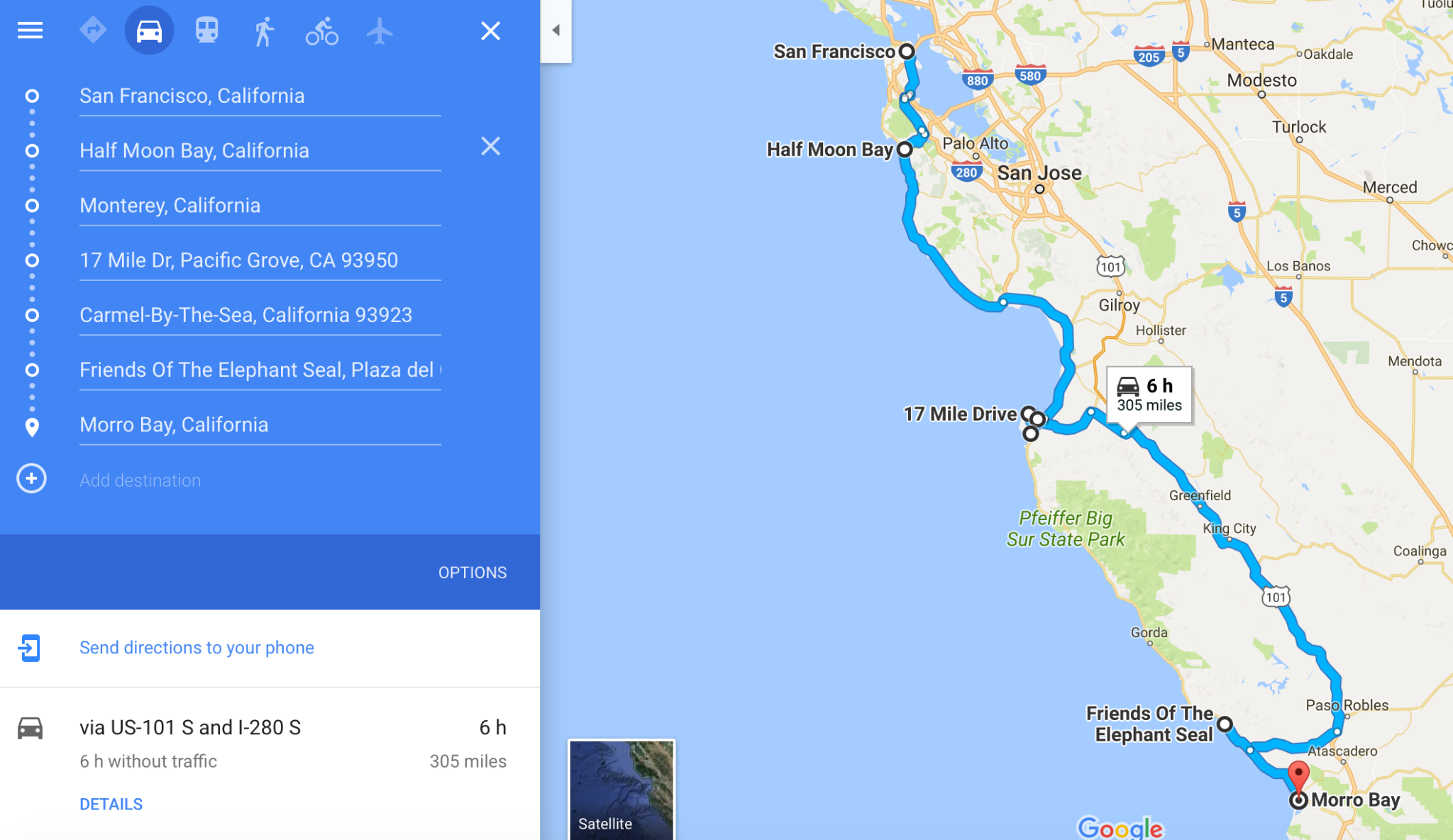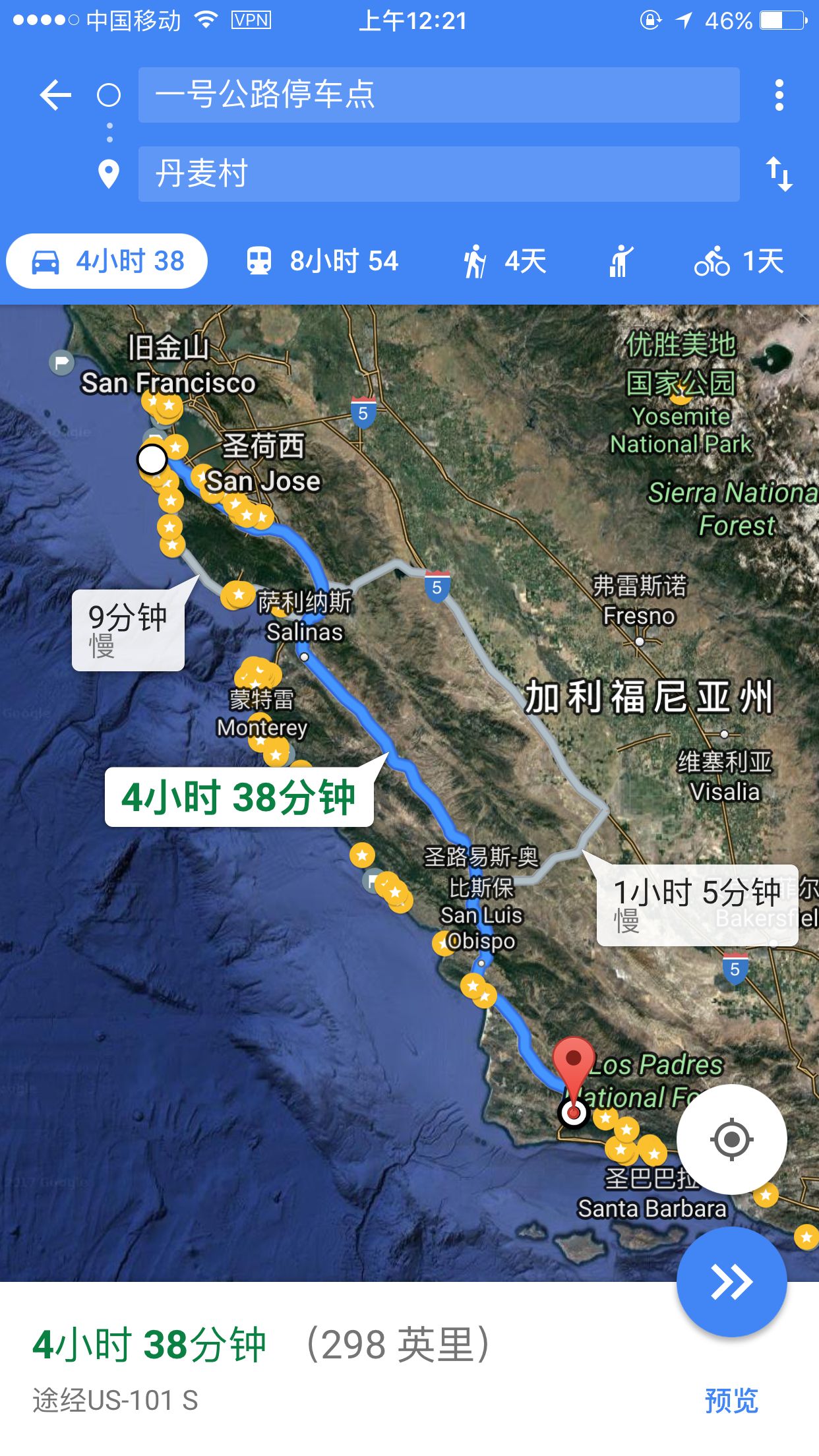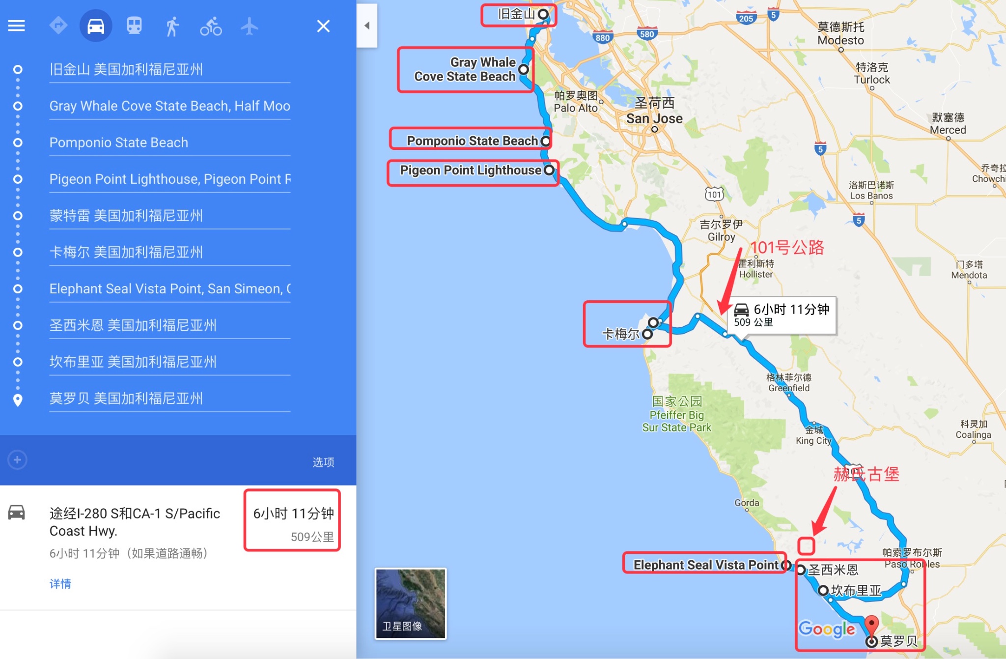 另:本日(圣西蒙、坎布里亚)or(莫罗湾Morro Bay)这三个地点均可作为住宿点(这几个地点之间距离不远,圣西蒙——莫罗贝全程大概不到50km车程);也可以根据你最后是否选择去参观赫氏古堡来决定住在哪里,如果去了赫氏古堡、那么住在圣西蒙or坎布里亚均可、如果没去赫氏古堡、直接开至莫罗贝(玩+住宿)也可以。具体路线行进动态、谷歌地图截图如下: