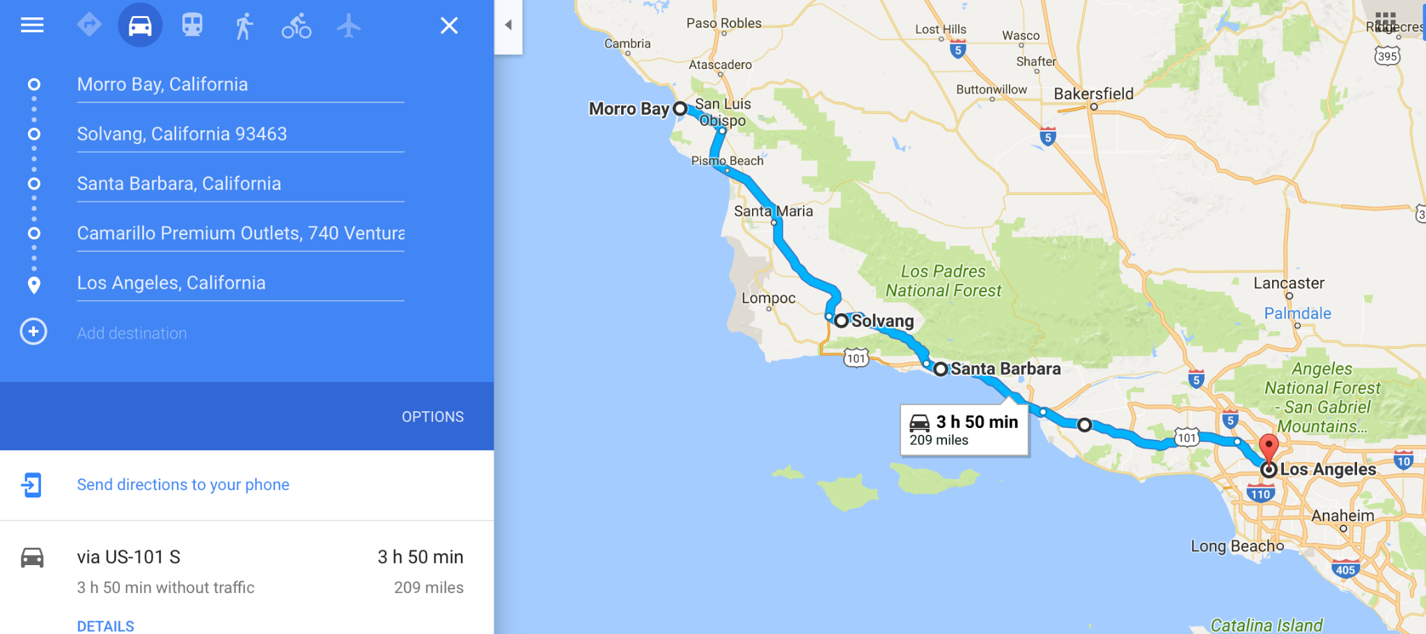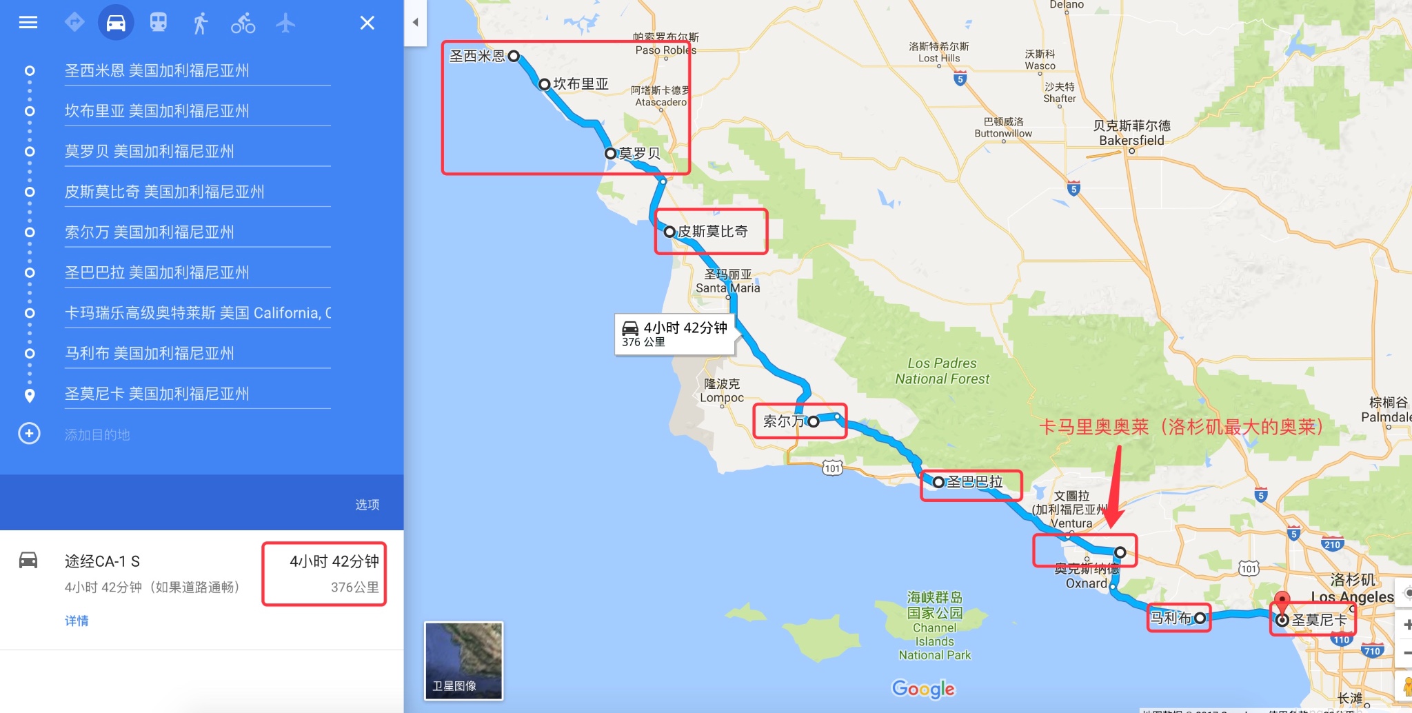 【D2】(圣西蒙、坎布里亚)or(莫罗湾Morro Bay)——皮斯莫比奇Pismo Beach——索尔万(丹麦村)——圣巴巴拉——卡马里奥奥莱(这里算是路过、不需要绕路,如果你有购物需求可以选择)——Malibu沙滩——抵达洛杉矶(圣莫妮卡海滩)。本日的游玩景色与前一日有些区别,前一日沿海景色比较多、本日特色小镇比较多,每个小镇之间只是方向上顺路、但如果要去的话还是要专程弯一下的,你们也可以根据自己的喜好来选择去哪个小镇、停留多久等。本日具体路线行进动态、谷歌地图截图如下: