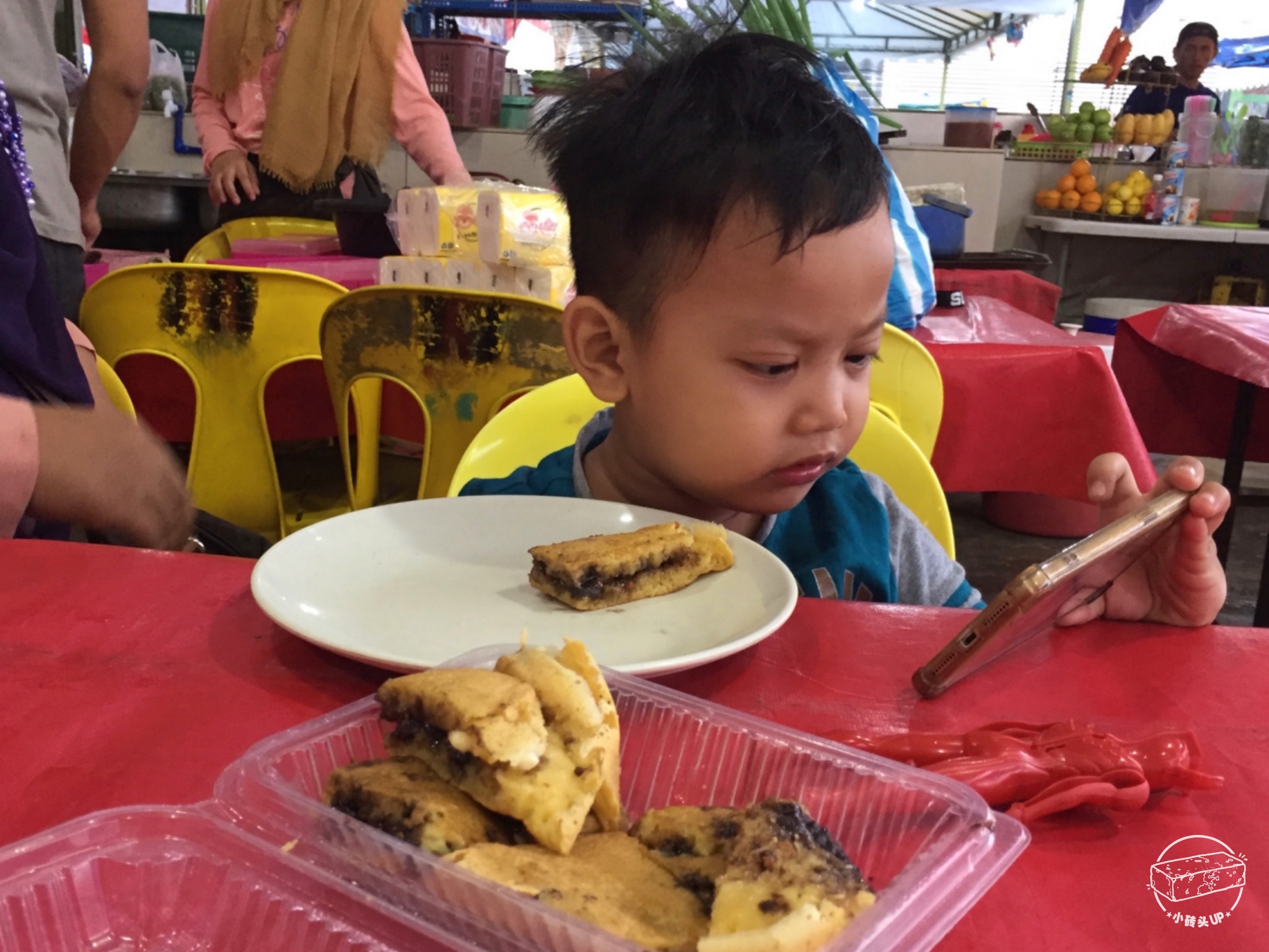 码头我还点了一份甜甜的饼,跟老板的儿子分享。很显然,动画片比饼更吸引他。