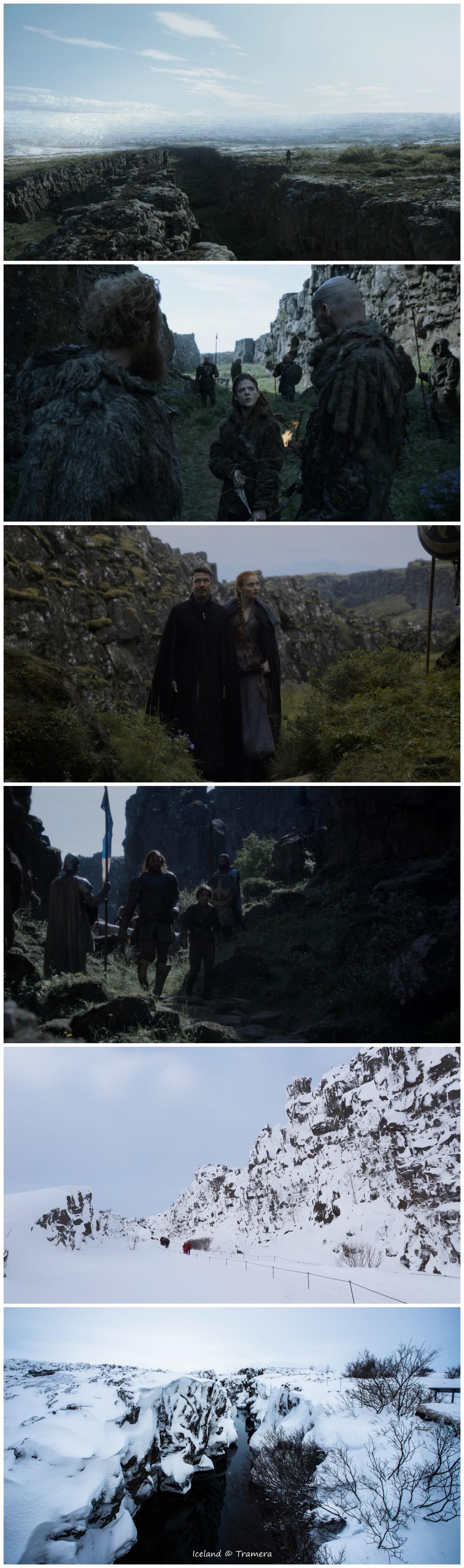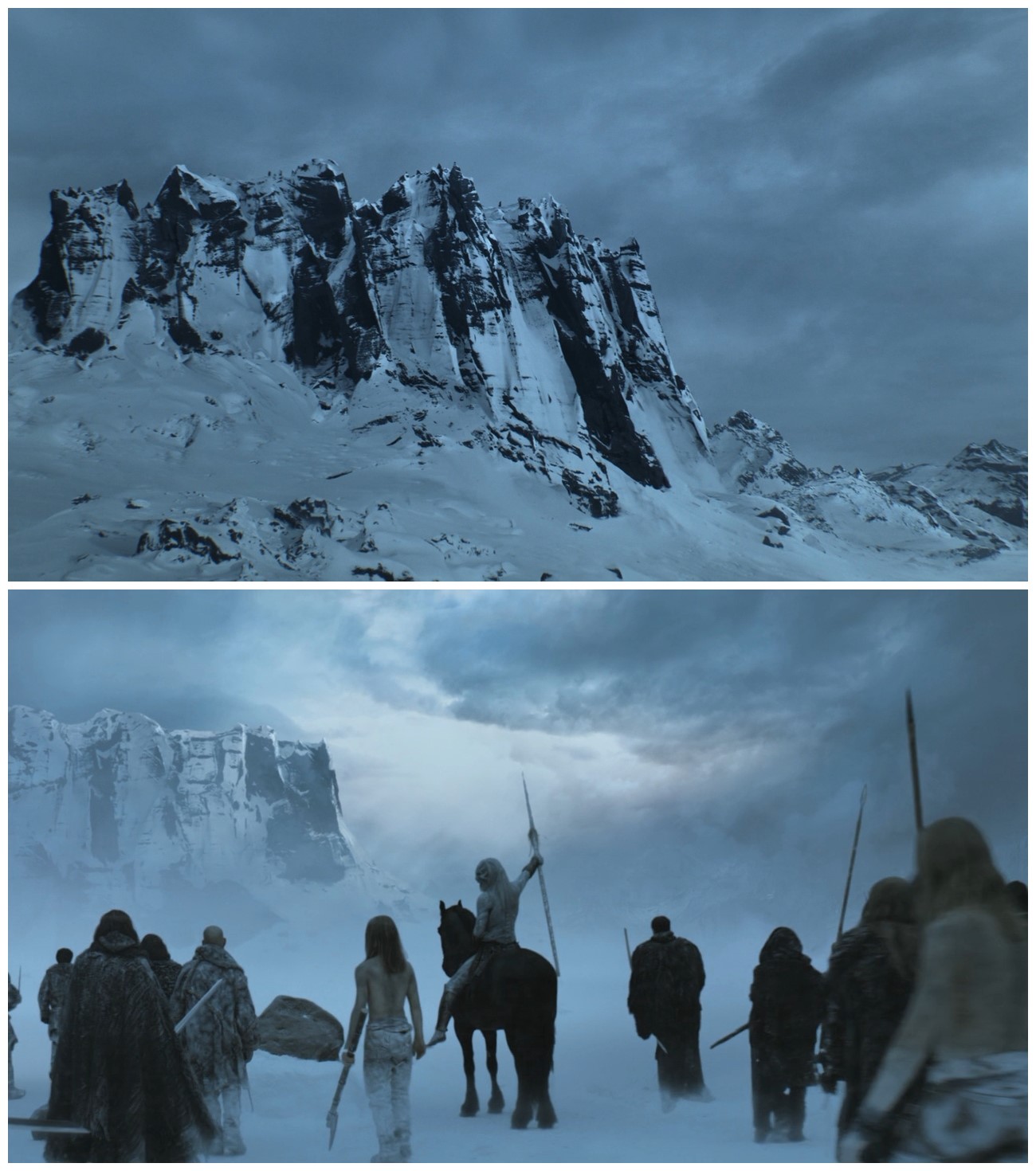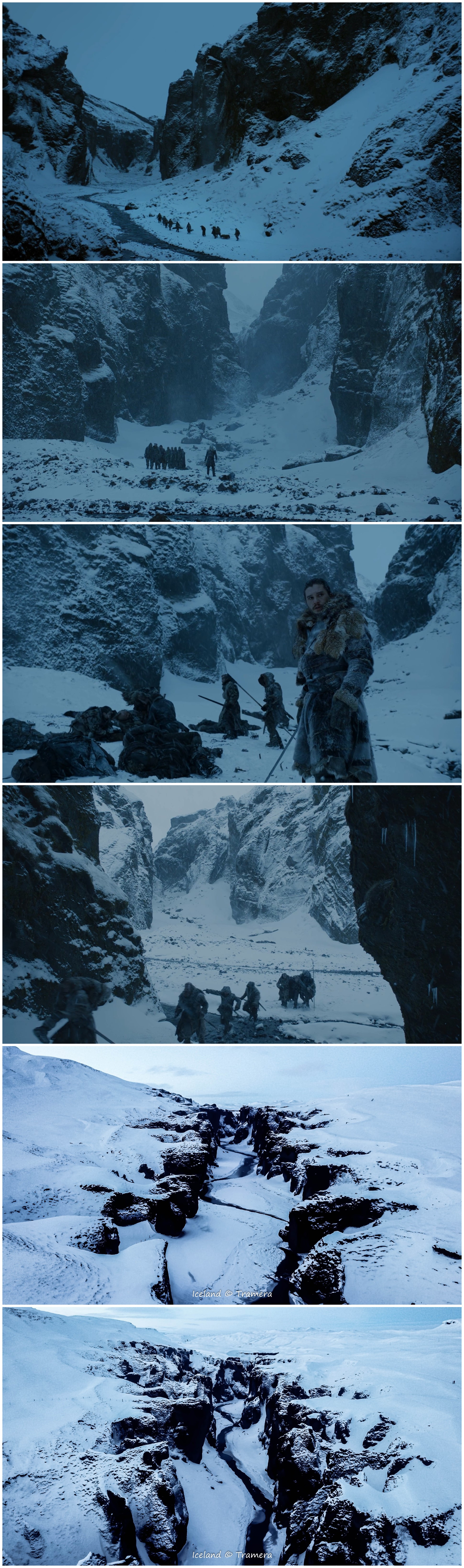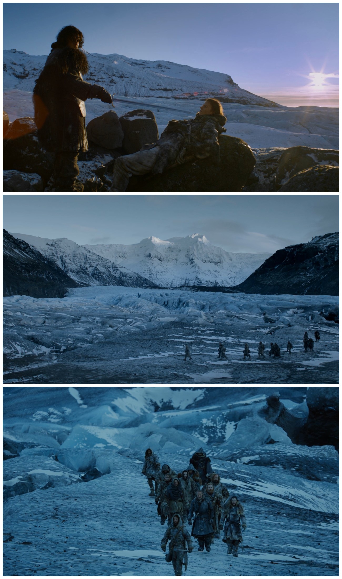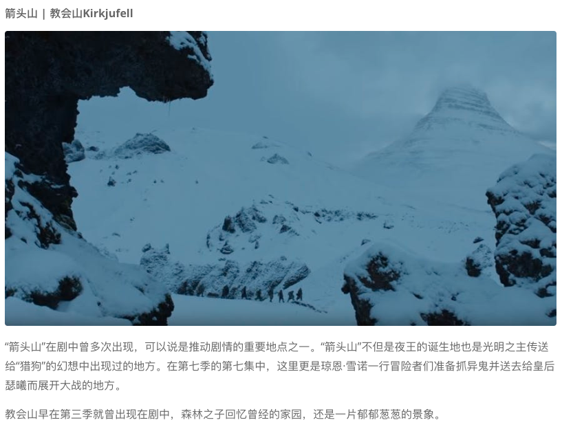 绝境长城(TheWall)及长城以北的大部分场景都是在瓦特纳冰川国家公园(Vatnajokull Glacier National Park)拍摄的。瓦特纳中的斯维纳山冰川,在剧中是一处坐落于七大王国极北地带、由冰雪筑成的巨大防御工事,这个伟大的“人造物”将王国与野人的土地分割开来,从最西端的霜雪之牙山脉,延伸至最东端的海豹湾。