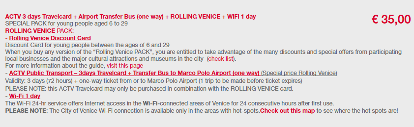 包含了3天的交通,一次的机场巴士和青年卡,这个青年卡是30岁以下的人办的,办了之后可以打半价,这个套餐就是包括了办卡费用+办卡之后打折的费用,如果超过这个年纪,还有其他的套餐,网址是这个https://www.veneziaunica.it/en/e-commerce/services。