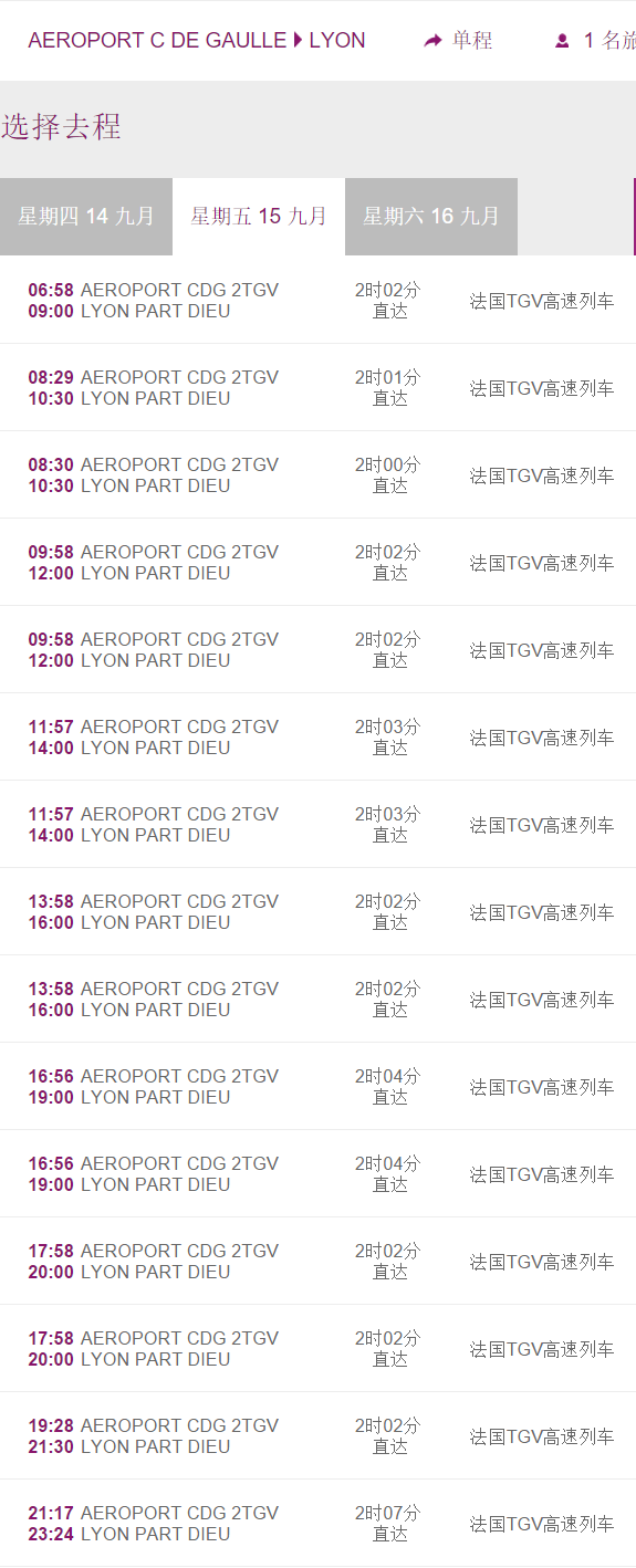巴黎到里昂 的TGV 火车巴黎 PARIS GARE DE LYON 出发 TGV 到达里昂 LYON PART DIEU 火车站,也有巴黎 PARIS BERCY 到 里昂 LYON PART DIEU还有 MARNE LA VALL...显示全部