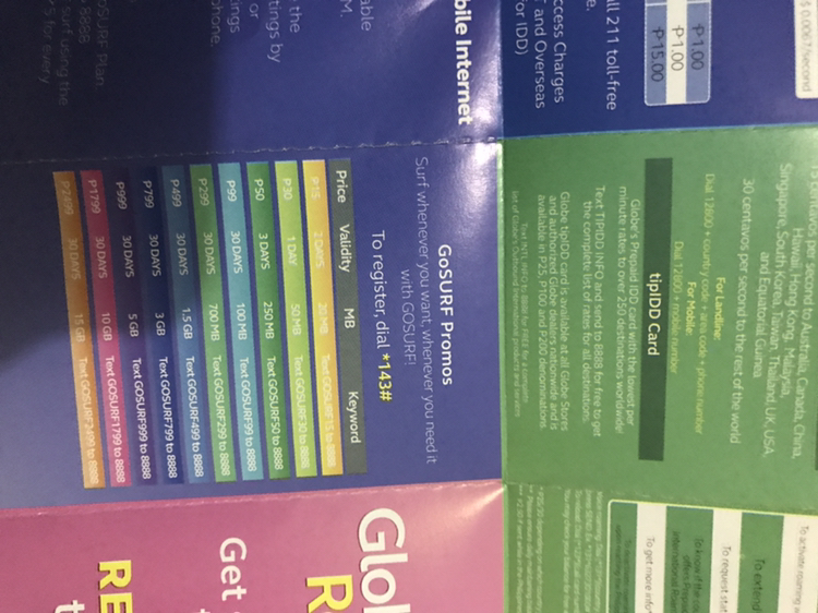 强烈建议买个Globe的电话卡哪儿都有卖 机场 商场 711都有卡和充值卡买来以后 自己发短信开无限流量套餐P50 1天 编辑“SUPERSURF50” 发送至8080P120 3天 编辑“SUPERSURF120”发送至8080P200 5天 编辑“SUPERSURF200”发送...显示全部