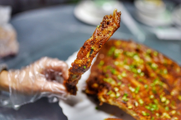 跳跳蛙和香辣鲈鱼都是招牌菜,我想吃鱼,他想吃蛙!鲈鱼肉质超嫩,刚开始没加热还觉得可以接受,加热以后越煮越辣,越辣越停不下来,里面还配有宽粉,吸满了汤汁和辣油,简直就是下饭神器啊!个人感觉跳跳蛙的口味比文和友的好吃,更加入味一些。跳跳蛙也是越加热越辣,我们两个人吃饭用了四分之一包抽纸,喝了四瓶冰水,一把鼻涕一把汗的,周围的美女糊着一脸精致的妆容淡定的吃着!(真英雄啊)推荐指数四颗星