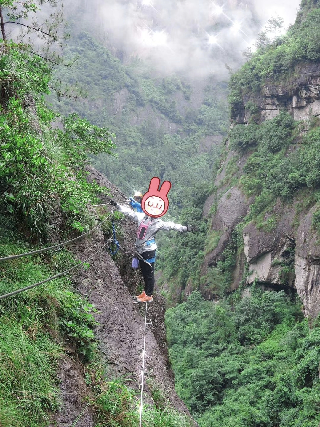 不可怕,你往上爬的时候是面对山的,一路向前向上看的,不暗示自己往下看不用怕的。一共有两条活动锁和一条固定锁,安全系数还是很牢靠的,只要你克服心里恐惧,而且有负责拍照的教练跟着,你实在害怕紧紧跟着教练。
