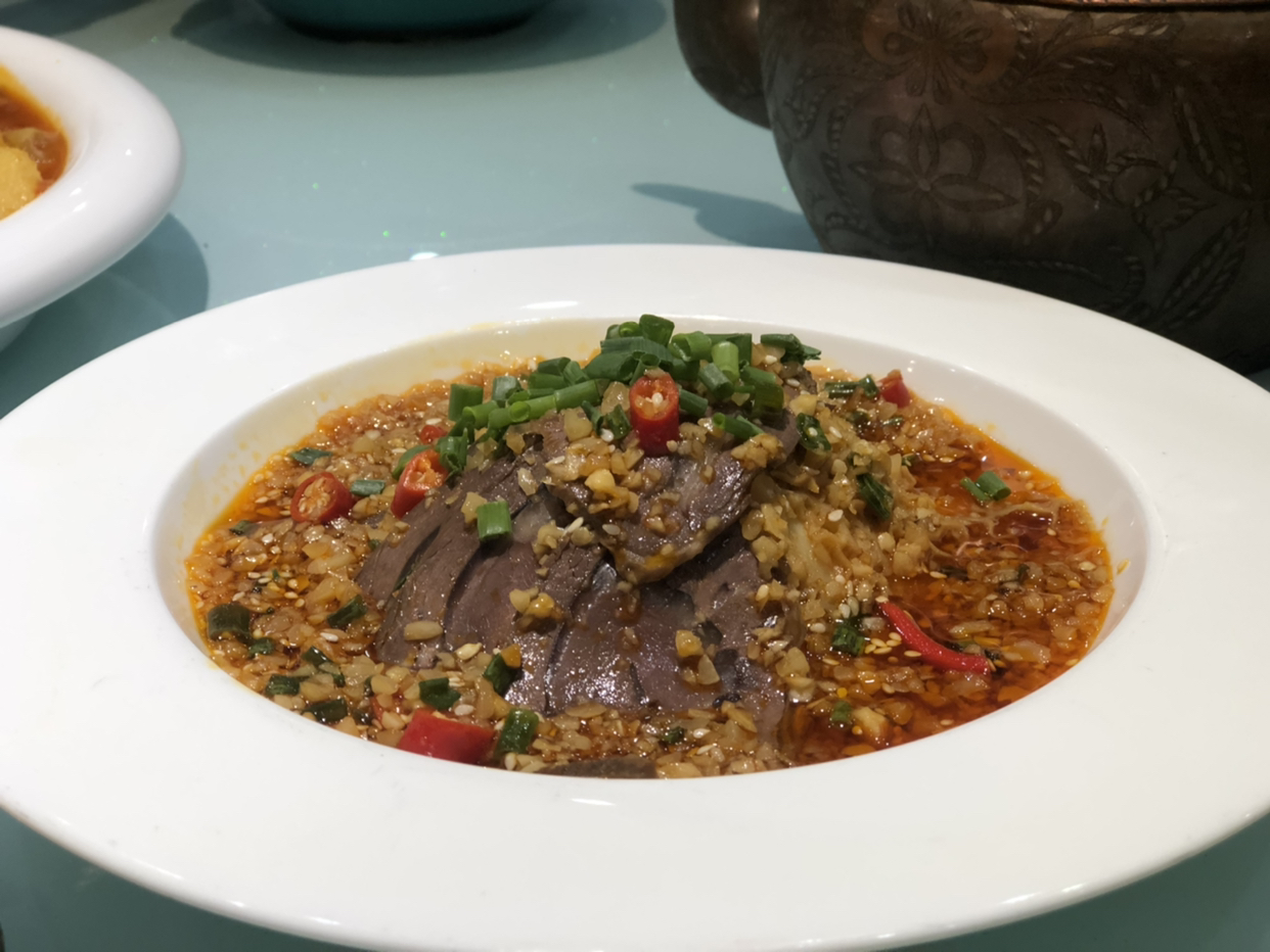那必须有夫妻肺片的名字呀!黄瓜片铺底,肺片摆盘,浇上红油辣子和蒜蓉辣酱。
