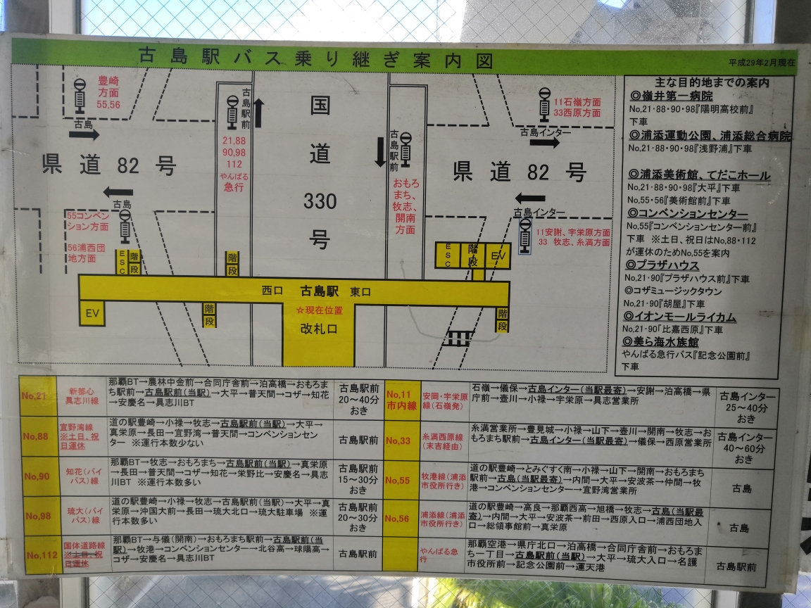 回来后自己回答一下这个问题吧。根据地图推荐的线路和自己的实地考察,住在牧志站附近,去古岛站搭途径的YKB大巴比较方便。从牧志站搭轻轨过去古岛站10分钟不到的时间,一出站闸口(改札口)可以看到以下这幅图,从出站口的西口(左边)下去后,沿着路走一...