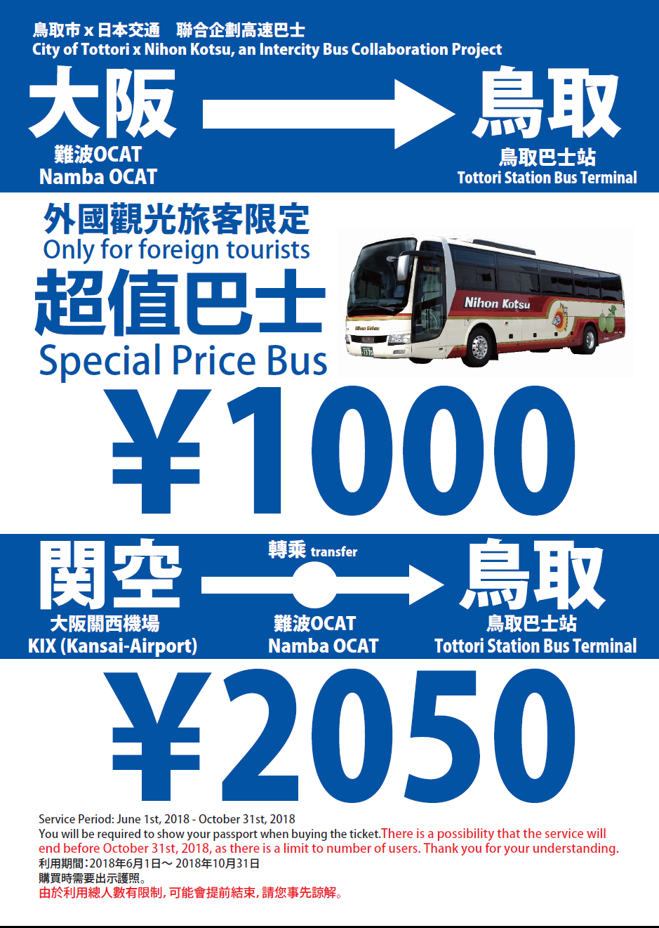 游记在这里↓ 2017.12/28-2018.1/4【母女冬关西跨年行】鸟取+大阪+京都+和歌山 //www.achim-lelle.com/i/8484066.html vlog在这里↓ ***19867797/ ★2020年3月31日前★坐巴士去鸟取有优惠 ★★★让更多的人知道★★★(不定时更新) 鸟取县为了吸引更多的外国游客,推出了1000日币的超值巴士 只限外国游客,只限大阪难波ocat—鸟取(单程) ...