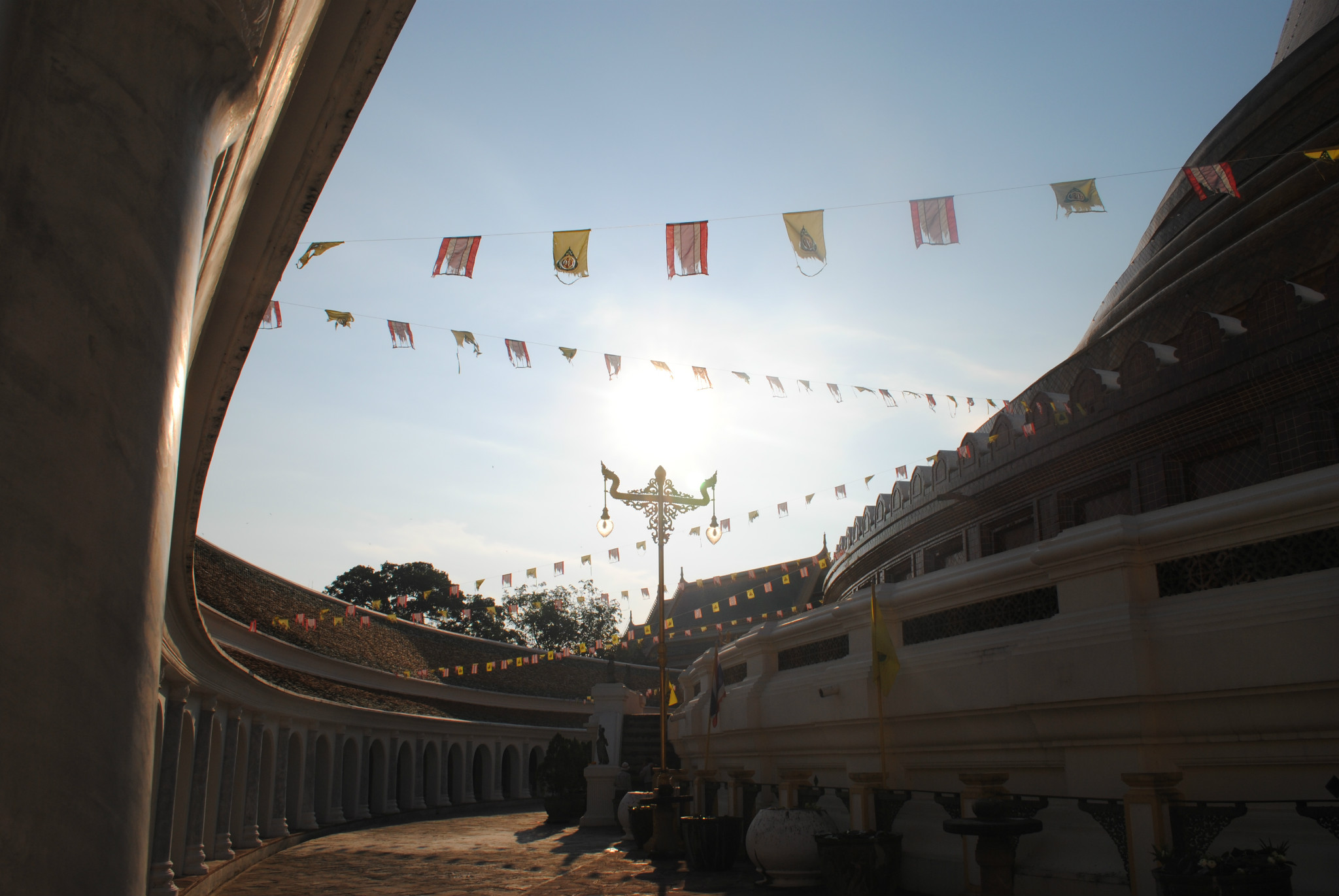 桂河大桥,折射了二战期间的一段历史:当年日军占领泰境期间,强迫盟军战俘建造铁路连接缅甸及暹罗,这条铁路在牺牲了无数宝贵性命后才得以完成,故有“死亡铁路”之称。桂河大桥就是其中的一段,被称为“死亡铁路”的咽喉。桂河大桥原为木桥,几经飞机轰炸,早已毁坏。重建后的桂河大桥,在原来桥的两侧圆弧铁架多出了两段不协调的方形铁架,没有原先圆弧铁架的优美,很多看过的人觉得不伦不类、不搭调。桂河大桥大约10分钟就可以走完。站在桂河大桥的桥头,看着夕阳下静静流淌的美丽桂河,使人难以想象这里发生过的悲惨故事,只有安放在桥头的美军投下未爆炸的炸弹提示着我们当年那场惨烈的战争。